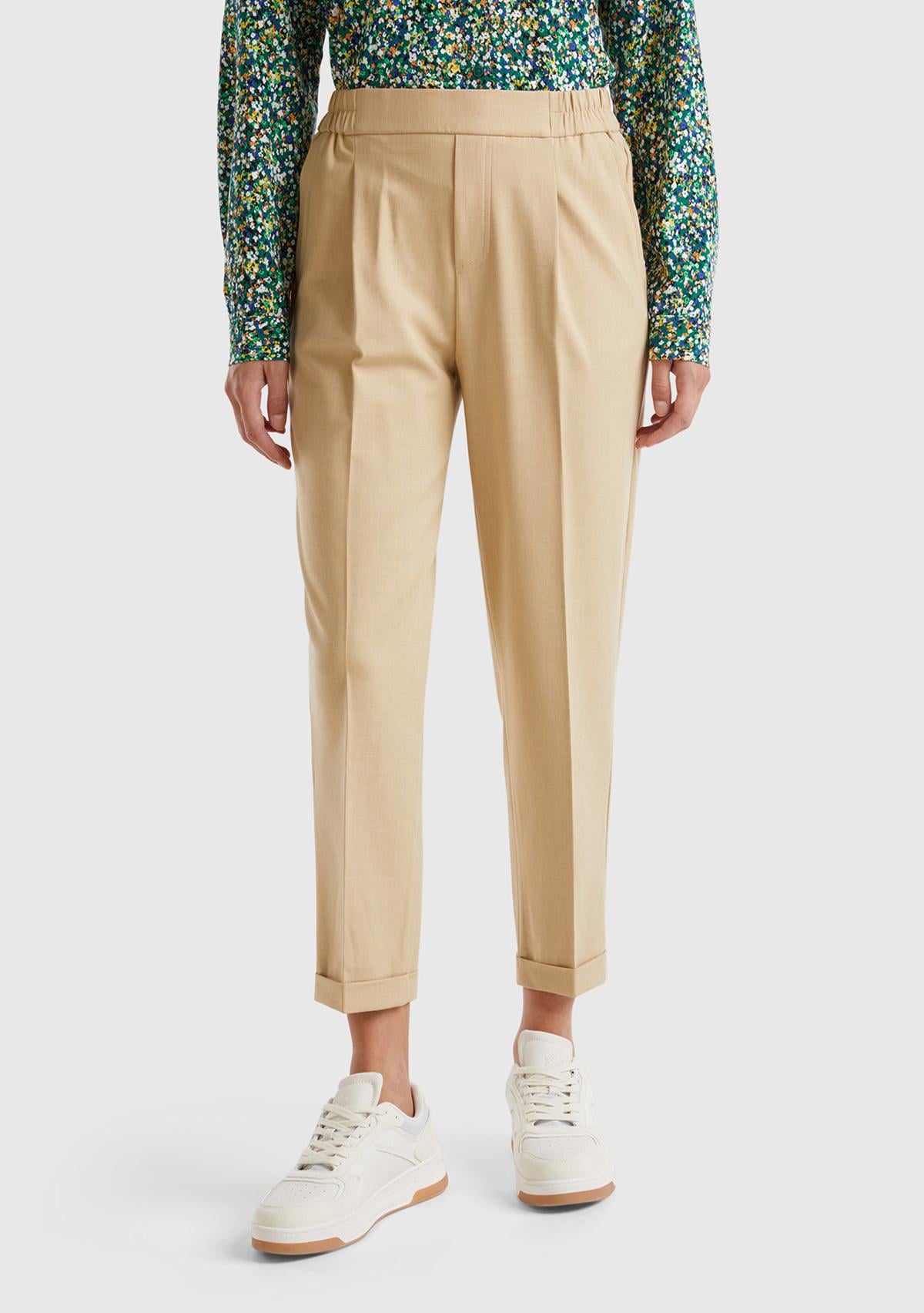 Kadın Bej Viskoz Karışımlı Yanı ve Arkası Büzgülü Kıvrık Paça Pantolon