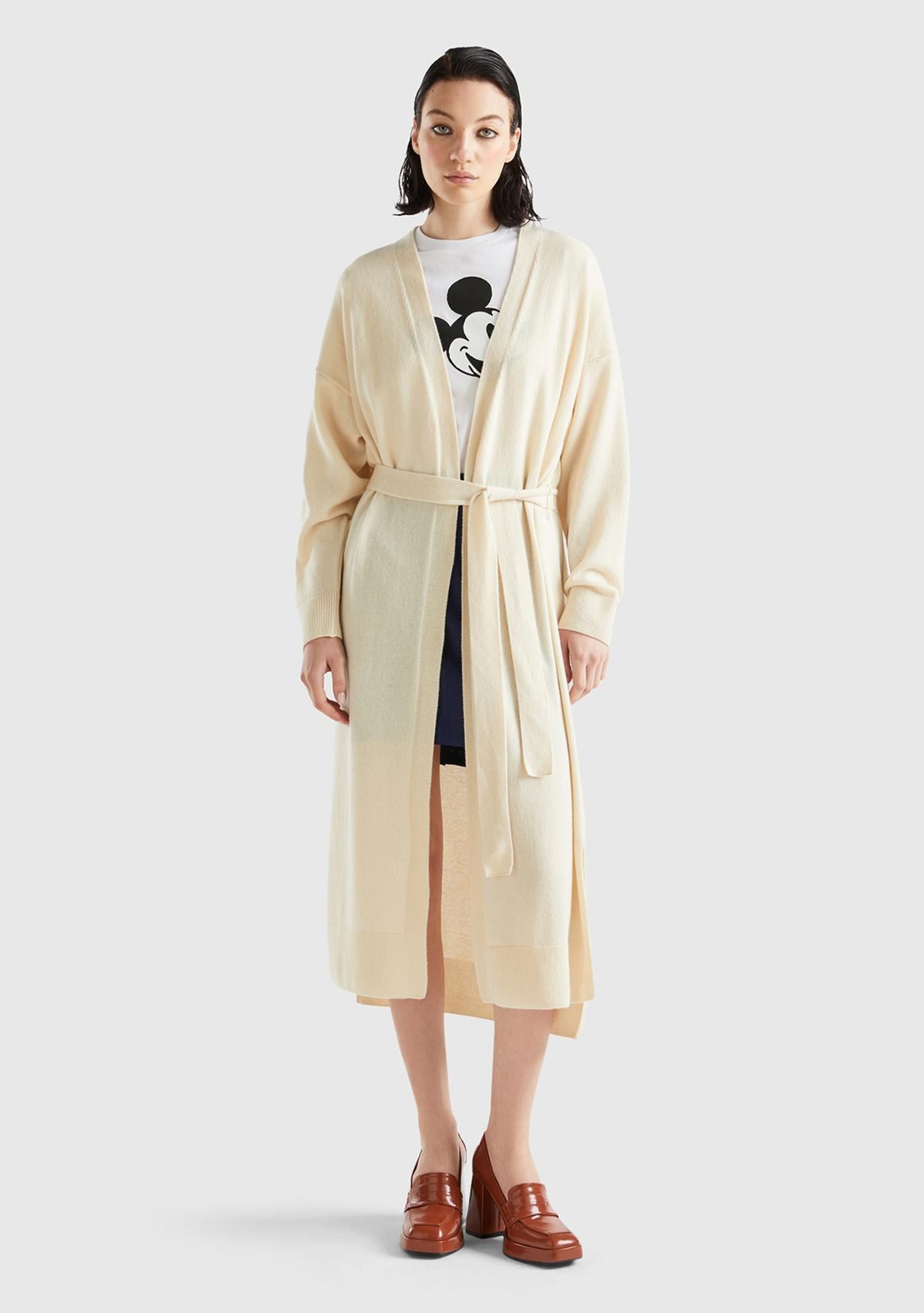 Kadın Bej Yün Karışımlı Belden Bağlamalı Hırka. Koyun Yünü İçerir