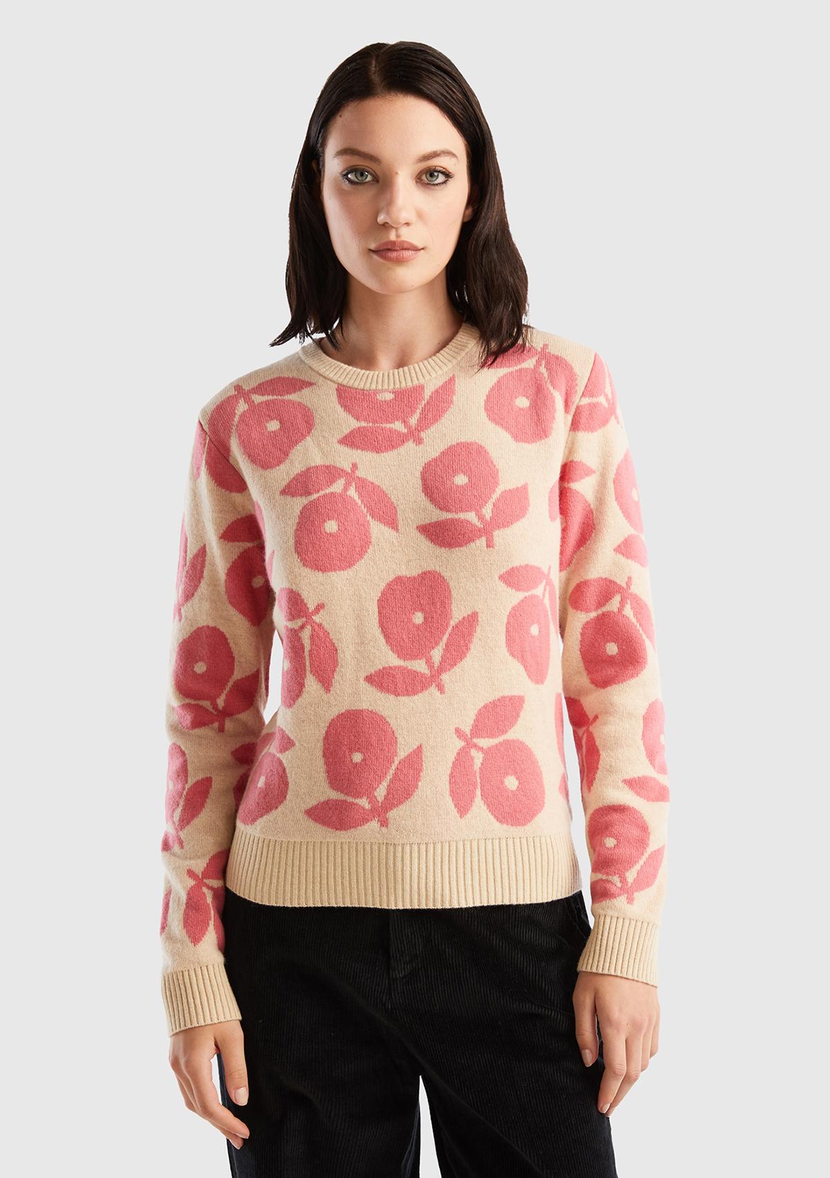 Kadın Bej Yün Karışımlı Çiçek Desenli Kazak. Koyun Yünü İçerir