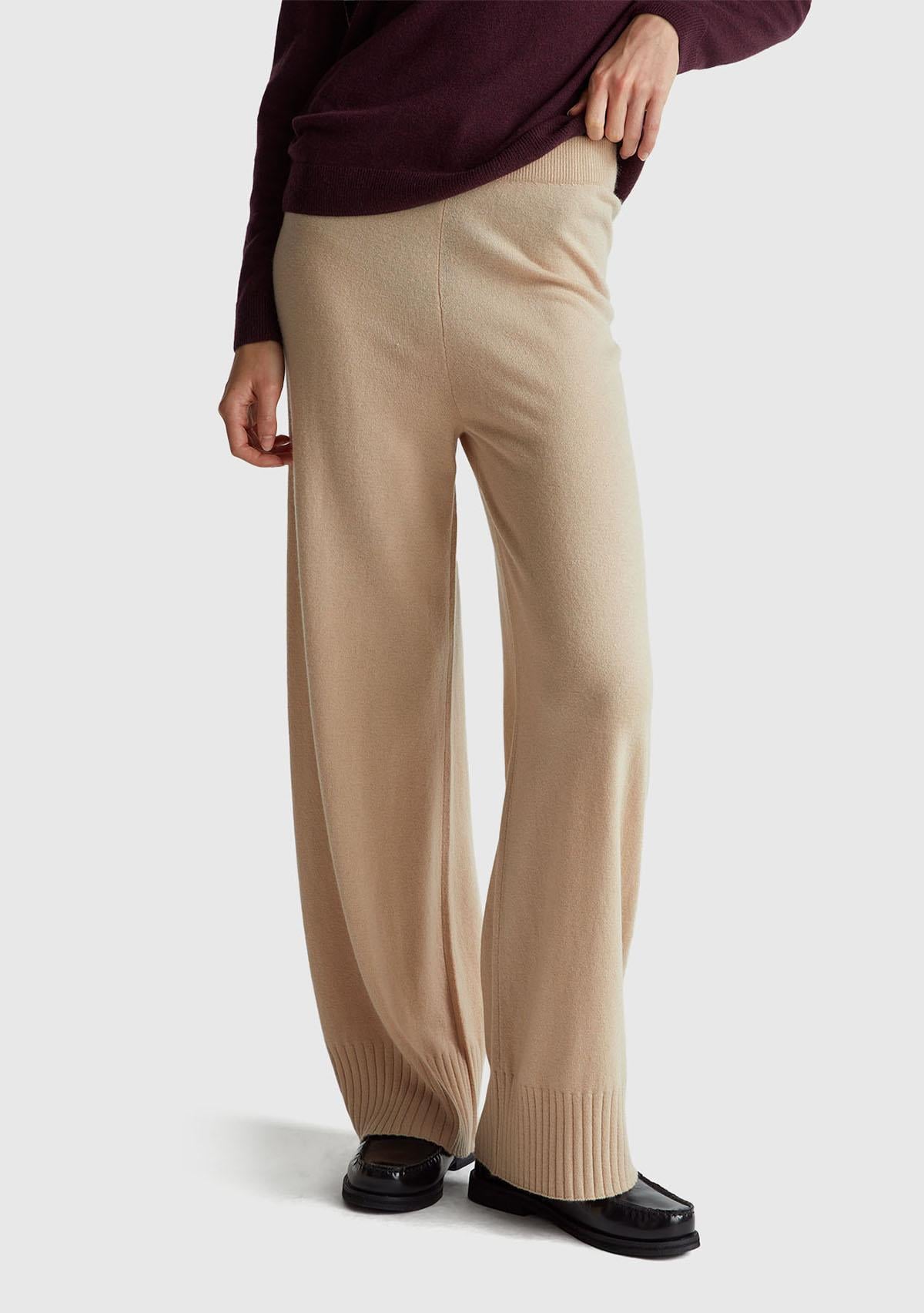 Kadın Bej Yün ve Kaşmir Karışımlı Ribana Detaylı Triko Pantolon