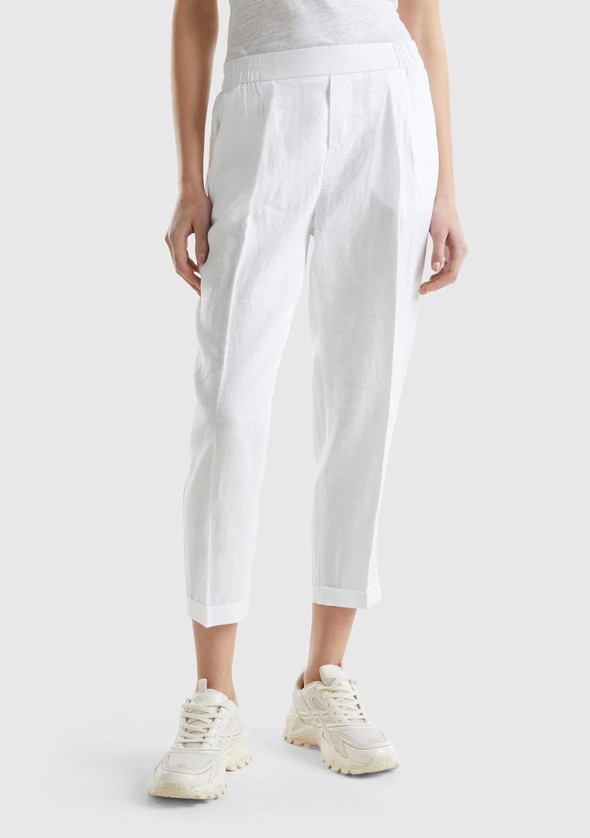 Kadın Beyaz %100 Keten Beli Lastikli Pantolon