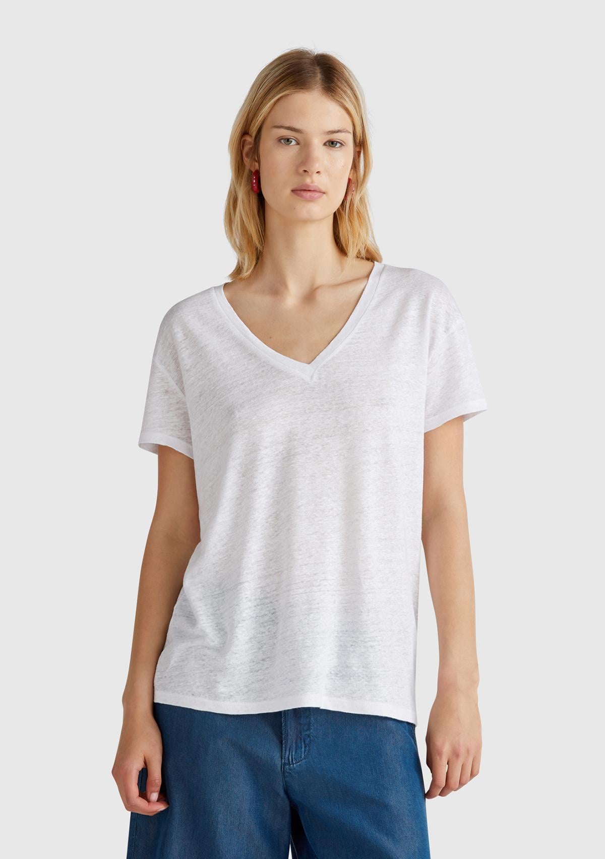 Kadın Beyaz %100 Keten Düşük Omuzlu Relax Fit V Yaka T-Shirt
