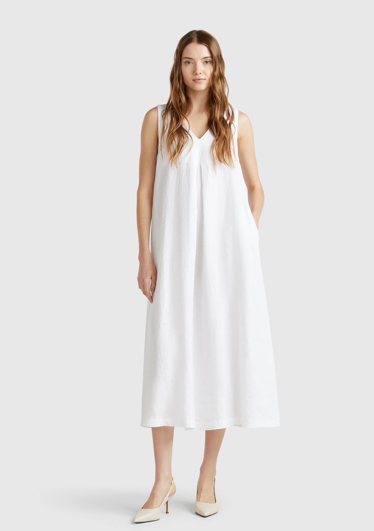 Kadın Beyaz %100 Keten V Yaka Kolsuz A Kesim Midi Elbise