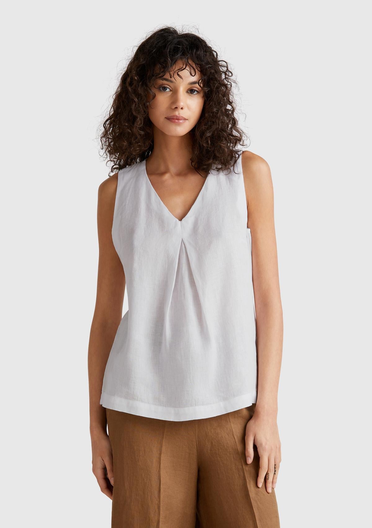 Kadın Beyaz %100 Keten V Yaka Kolsuz Geniş Kesim Bluz