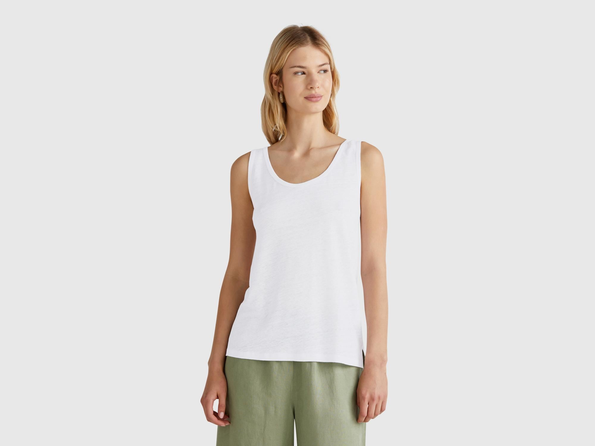 Kadın Beyaz %100 Keten Yanları Yırtmaçlı Regular Fit Yuvarlak Yaka Atlet