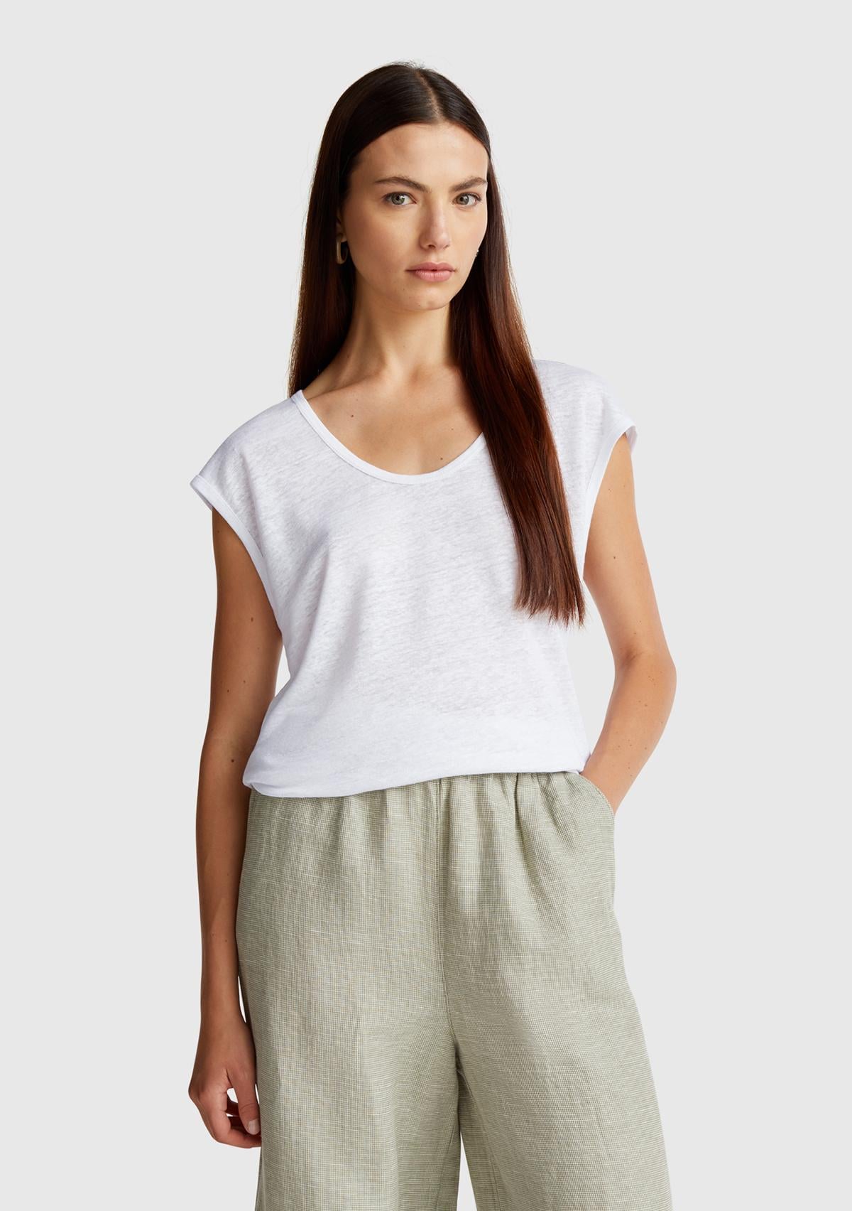 Kadın Beyaz %100 Keten Yanları Yırtmaçlı Relax Fit Yuvarlak Yaka T-Shirt