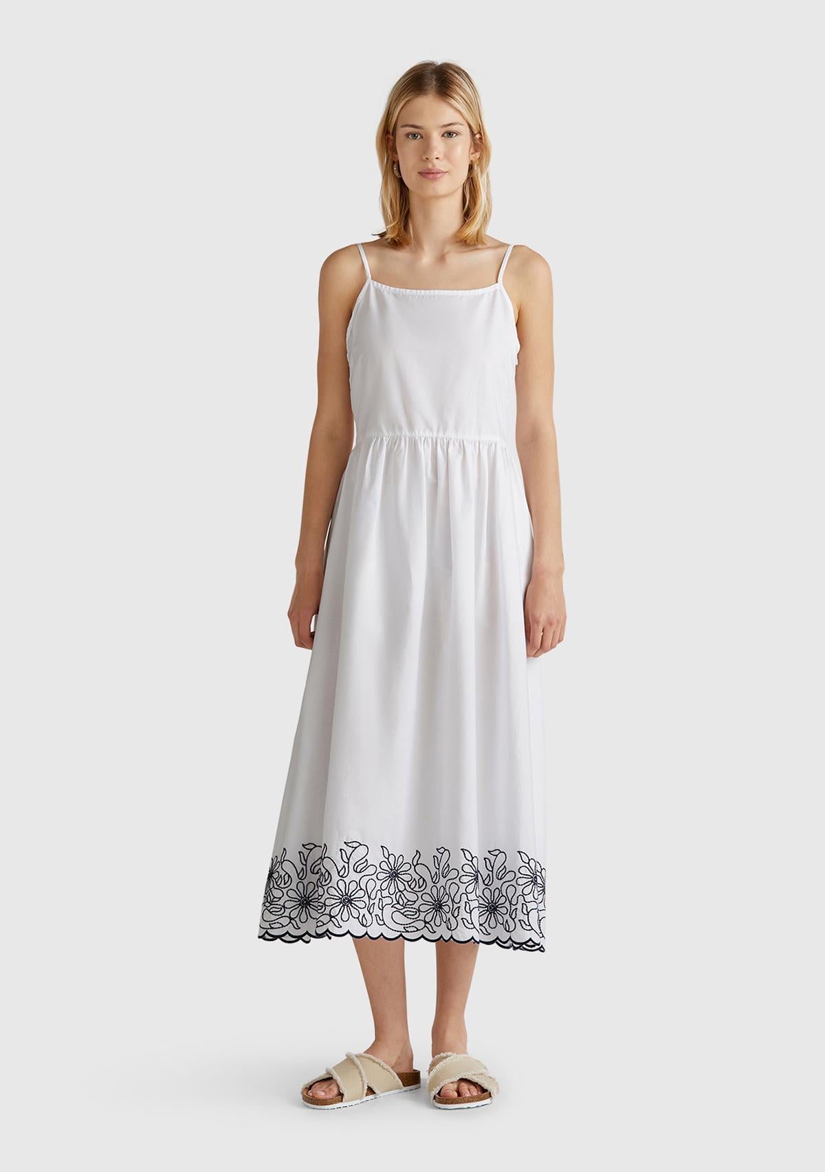 Kadın Beyaz %100 Koton Askılı Etek Ucu İşlemeli Midi Boy Elbise