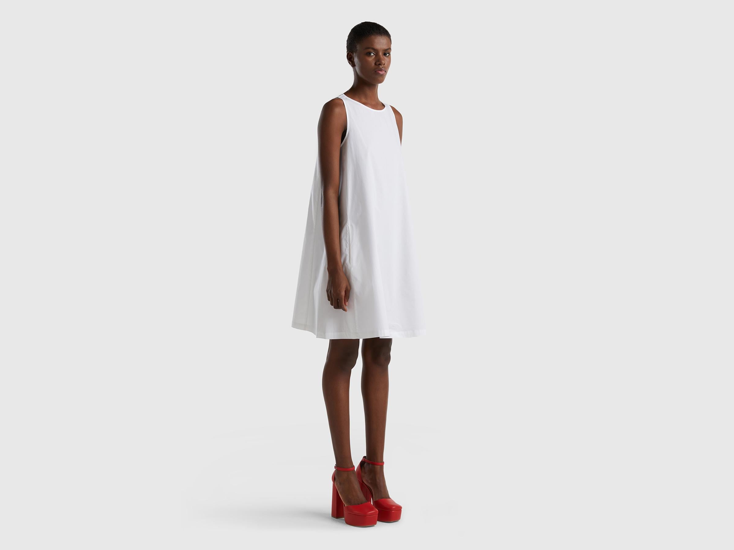 Saf pamuklu kumaştan üretilmiş, yuvarlak yakalı, yan cepli, arkası fermuarlı kadın trapez elbise. Rahat ve ferah tasarımıyla sıcak yaz günleri için ideal bir seçenek. Hem spor hem de şık stilde kombinlemeye uygun.