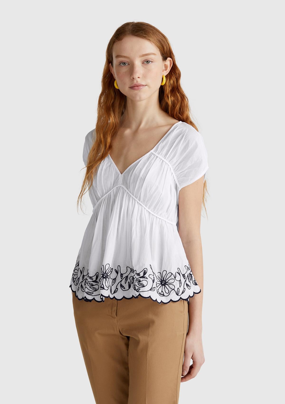 Kadın Beyaz %100 Koton Rahat Kalıp Çiçek İşlemeli Kısa Kollu Bluz