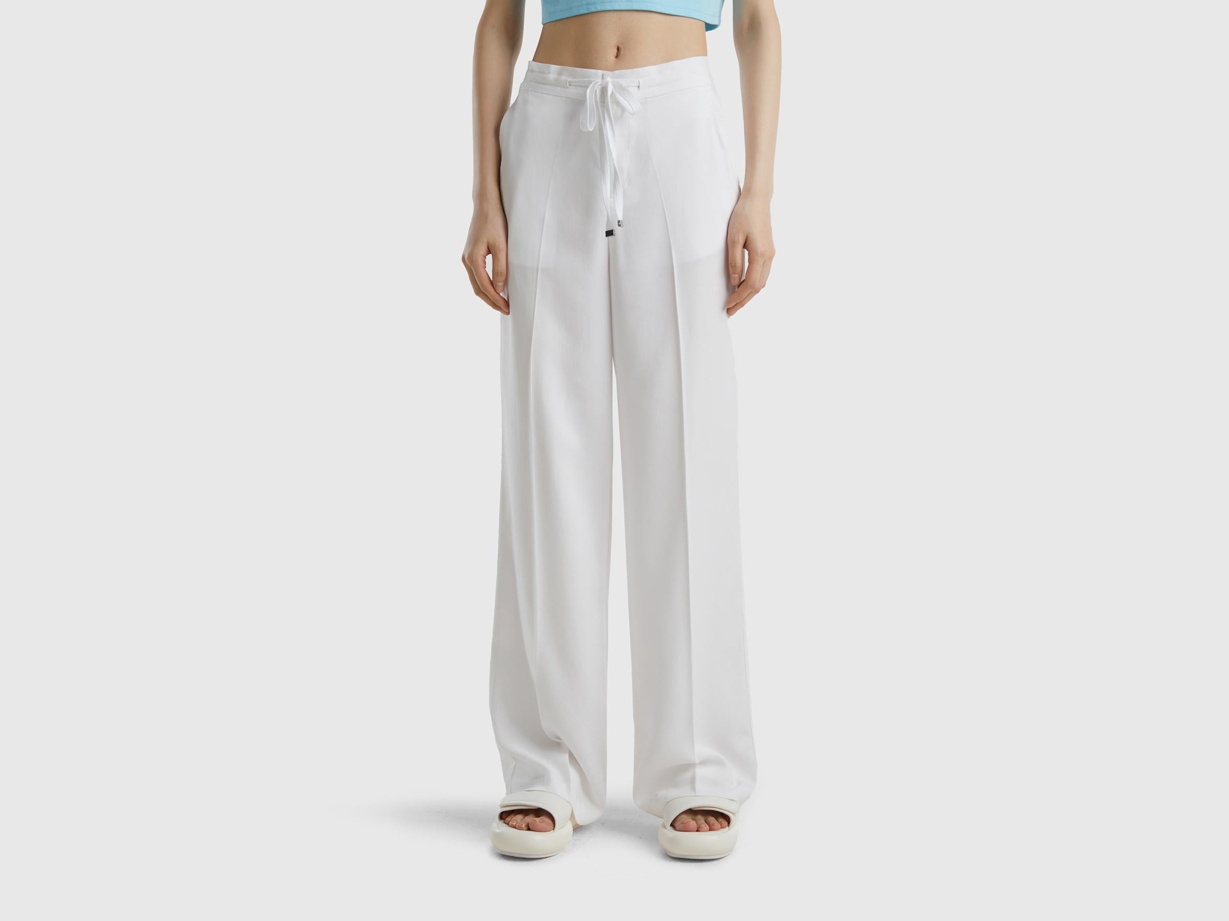 Kadın Beyaz %100 Liyosel Önü Pileli Beli İpli ve Düğmeli Pantolon