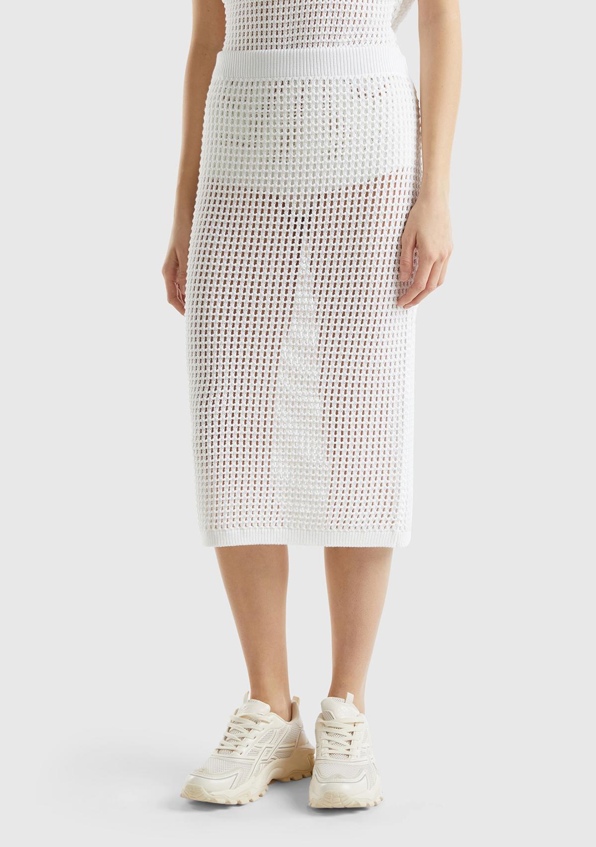 Kadın Beyaz %100 Pamuk Örgü Motifli Diz Altı Etek
