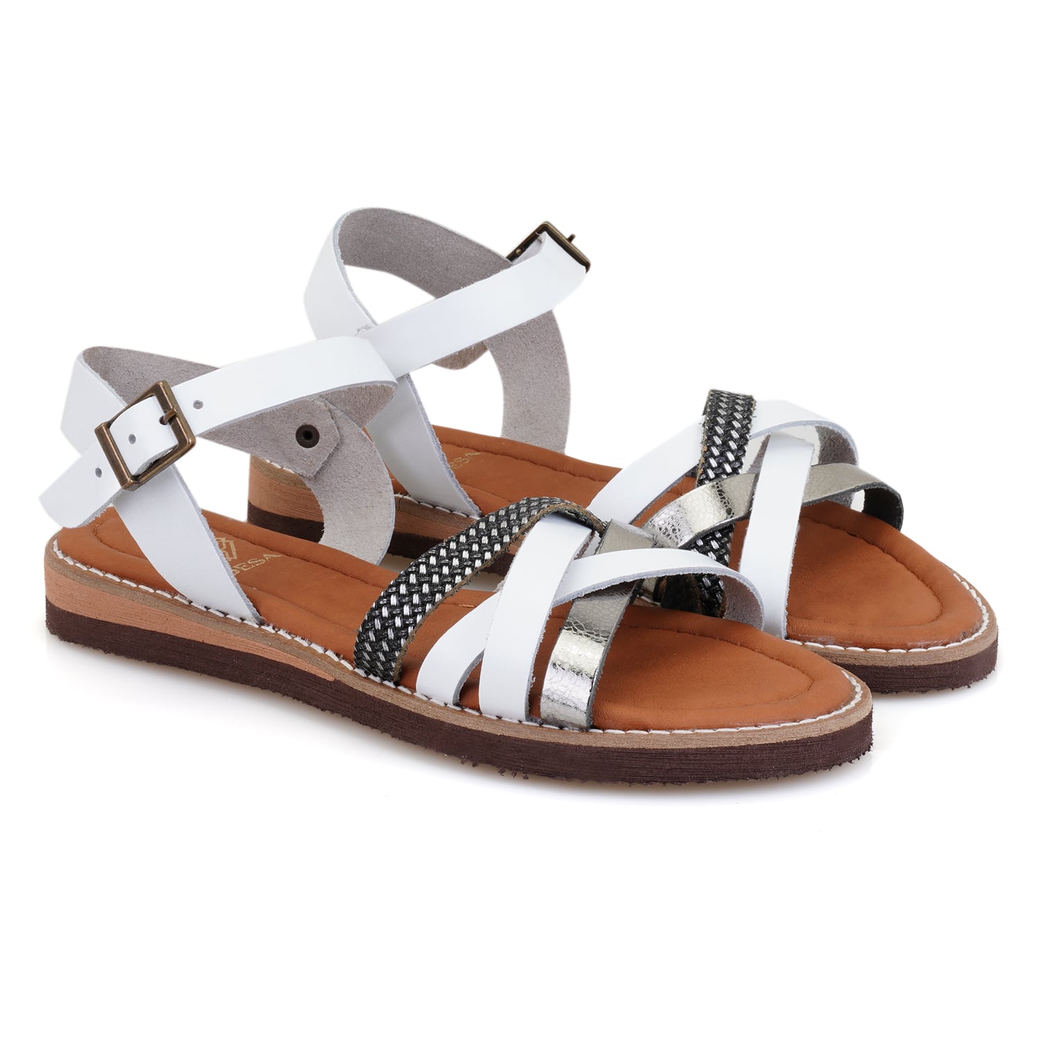 Kadın Beyaz Ayarlanabilir Tokalı Deri Sandalet