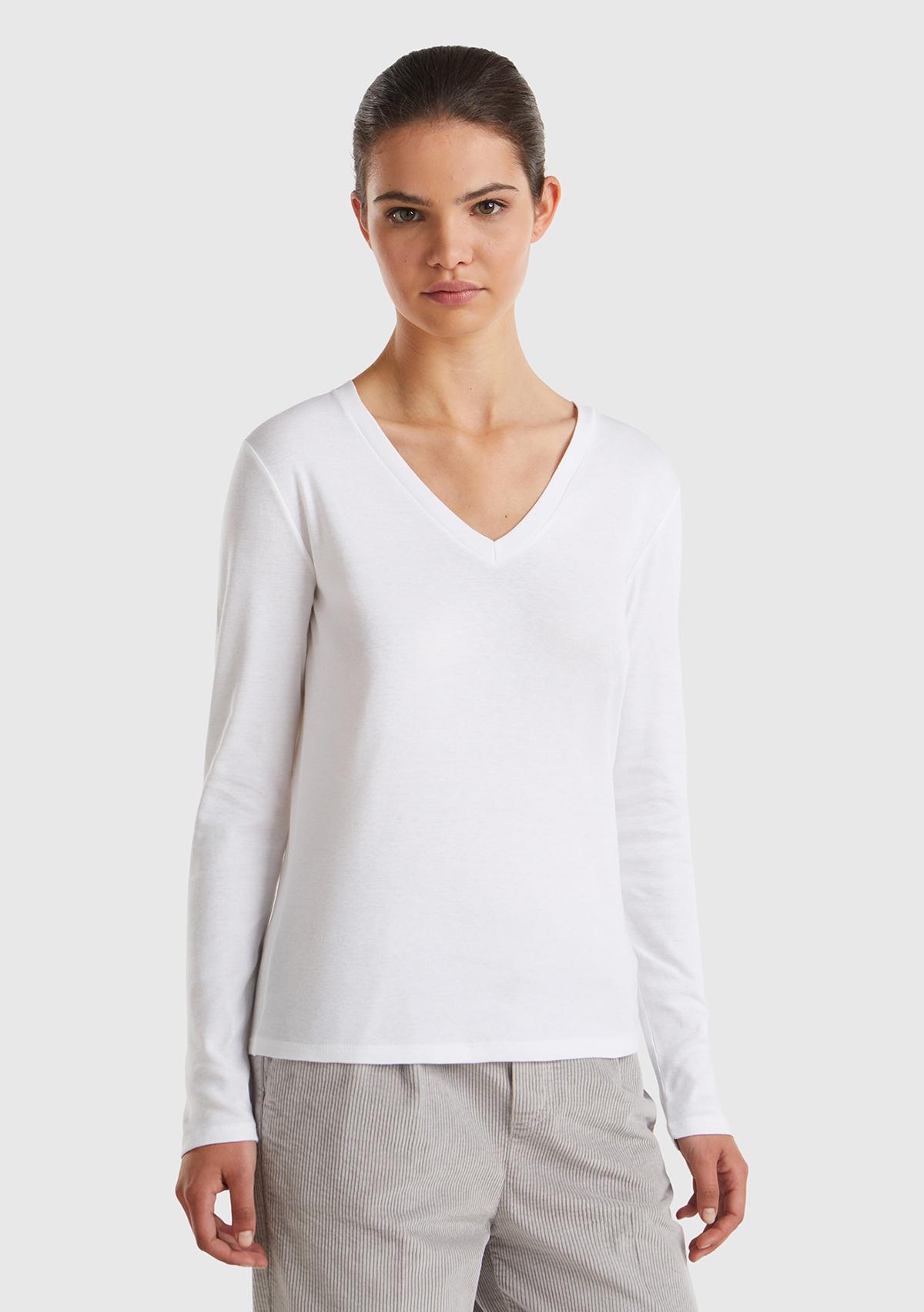 Kadın Beyaz Basic V Yaka Uzun Kollu T-Shirt