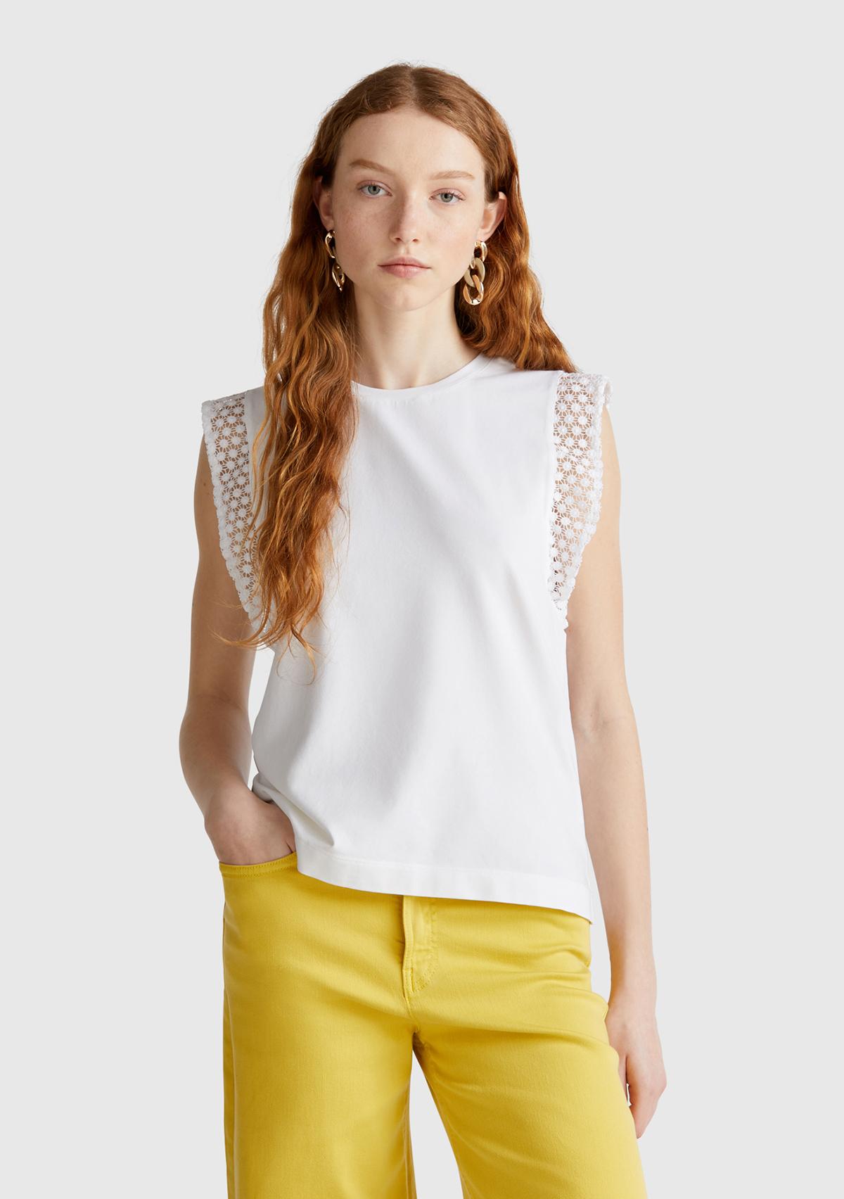 Kadın Beyaz Dantel Detaylı Kolsuz Esnek T-Shirt