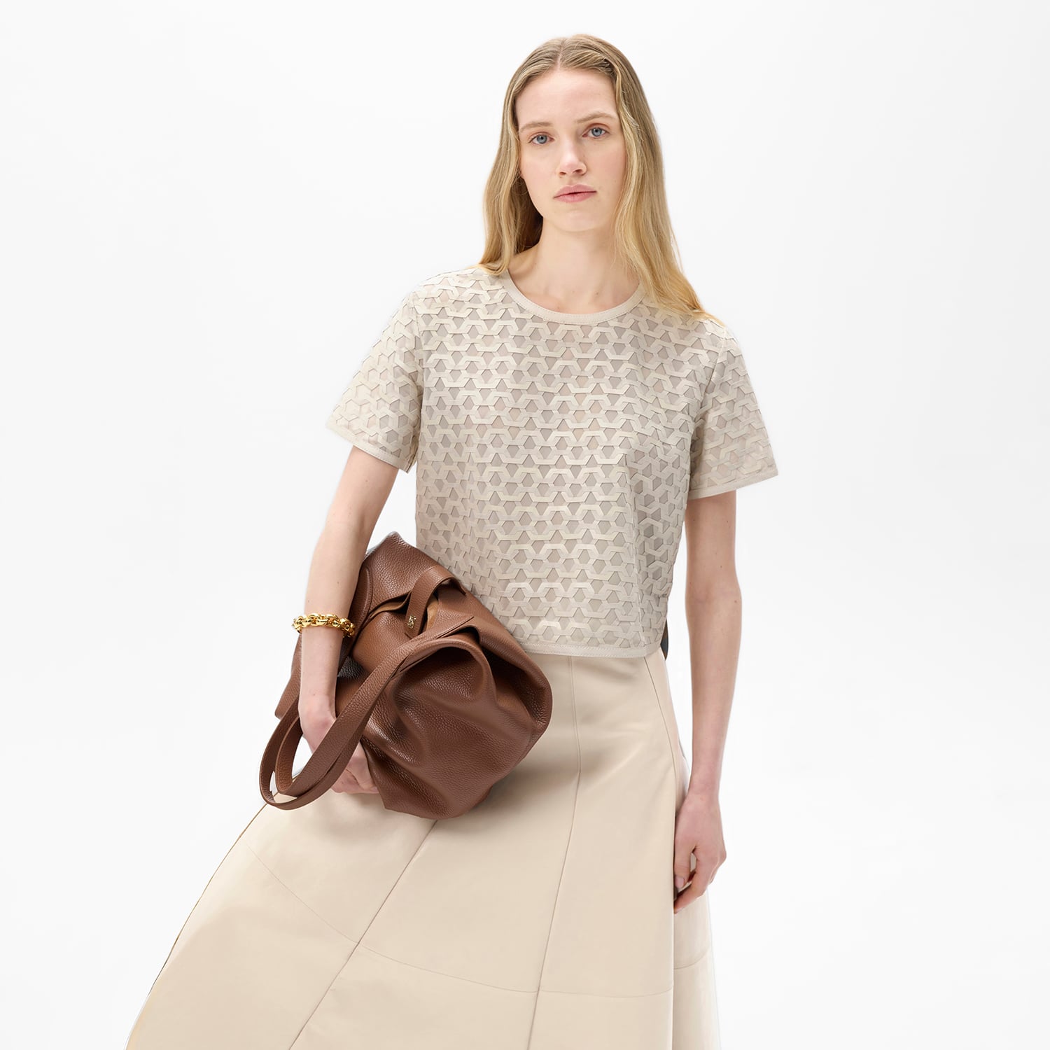 Ön yüzünde özel olarak tül üzerine lamine tekniği ile deri ve süet harmanlaştırarak geometrik şekiller ile hareketlilik verilmiştir.