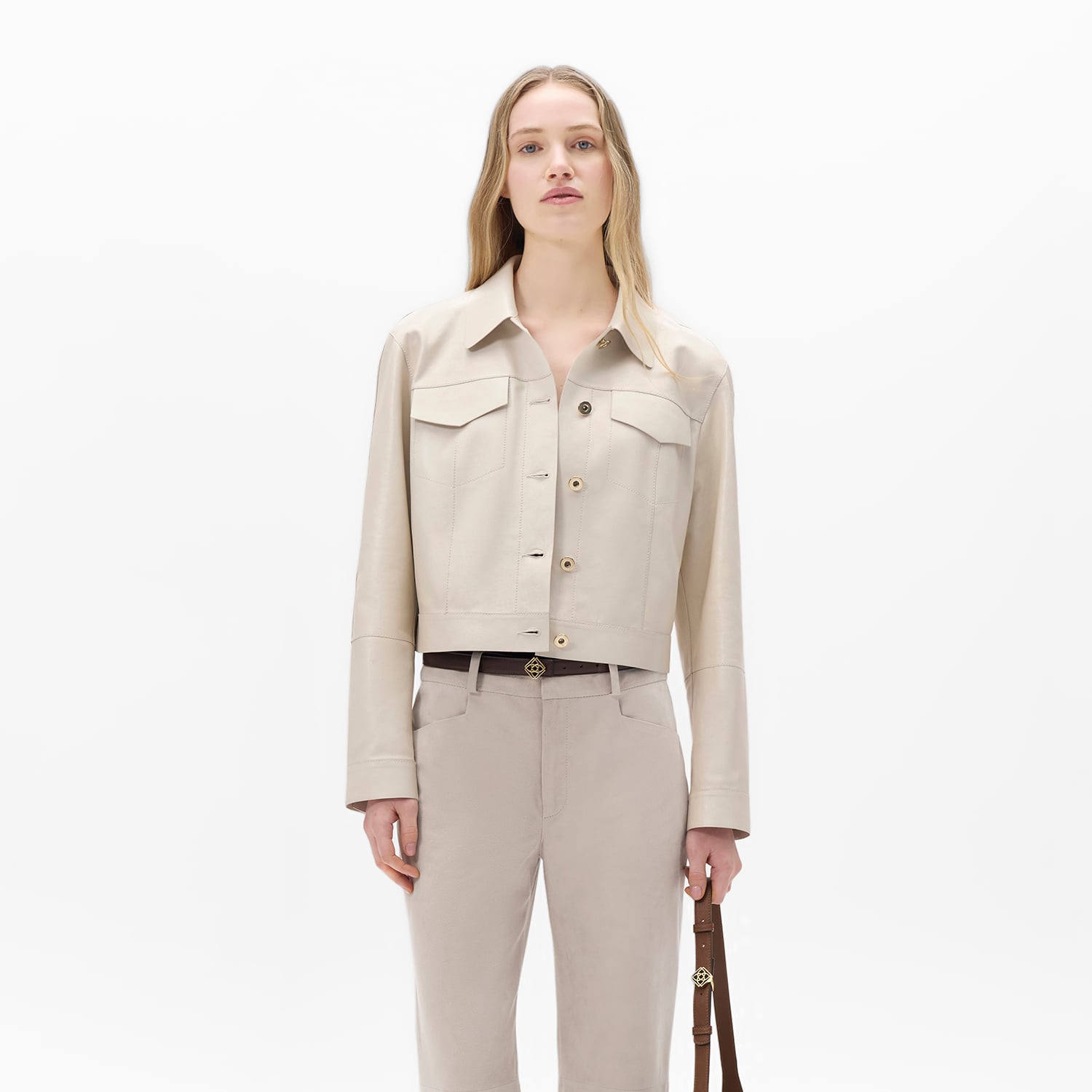 Kadın Beyaz Gömlek Yaka Metal Düğme Detaylı Deri Ceket