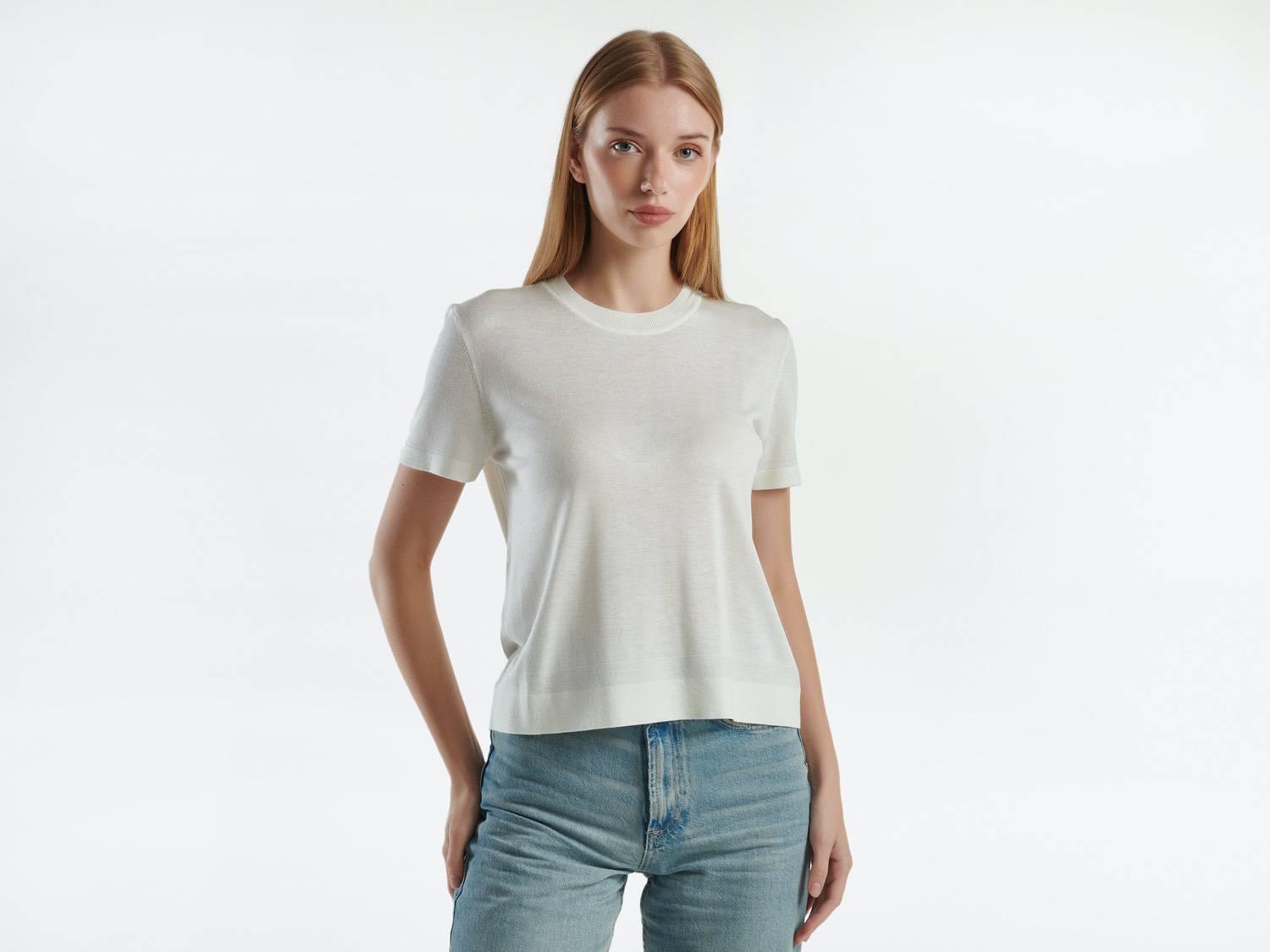 Kadın Beyaz İpek Karışımlı Yuvarlak Yaka Önü Detaylı Kısa Kollu Kazak. İpek Böceği İpeği İçerir