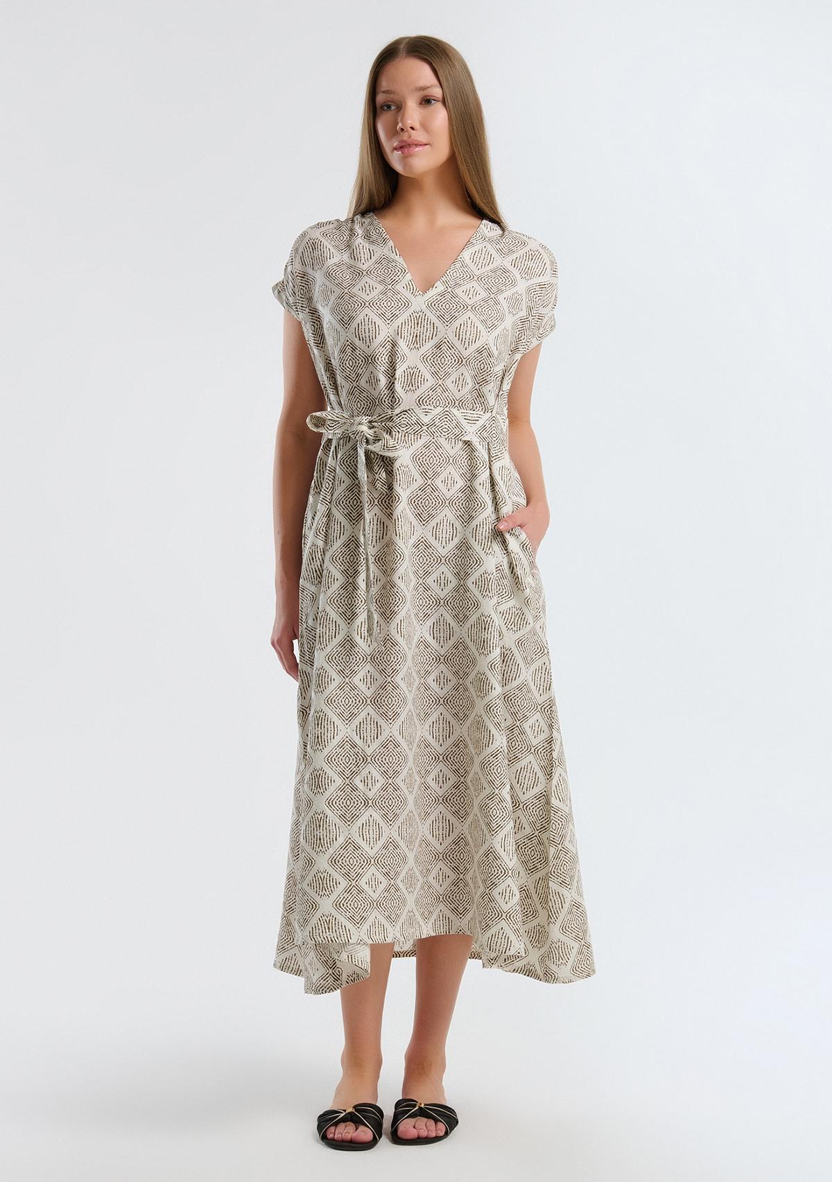 Kadın Beyaz Mix %100 Keten Desenli V Yaka Cepli Uzun Elbise