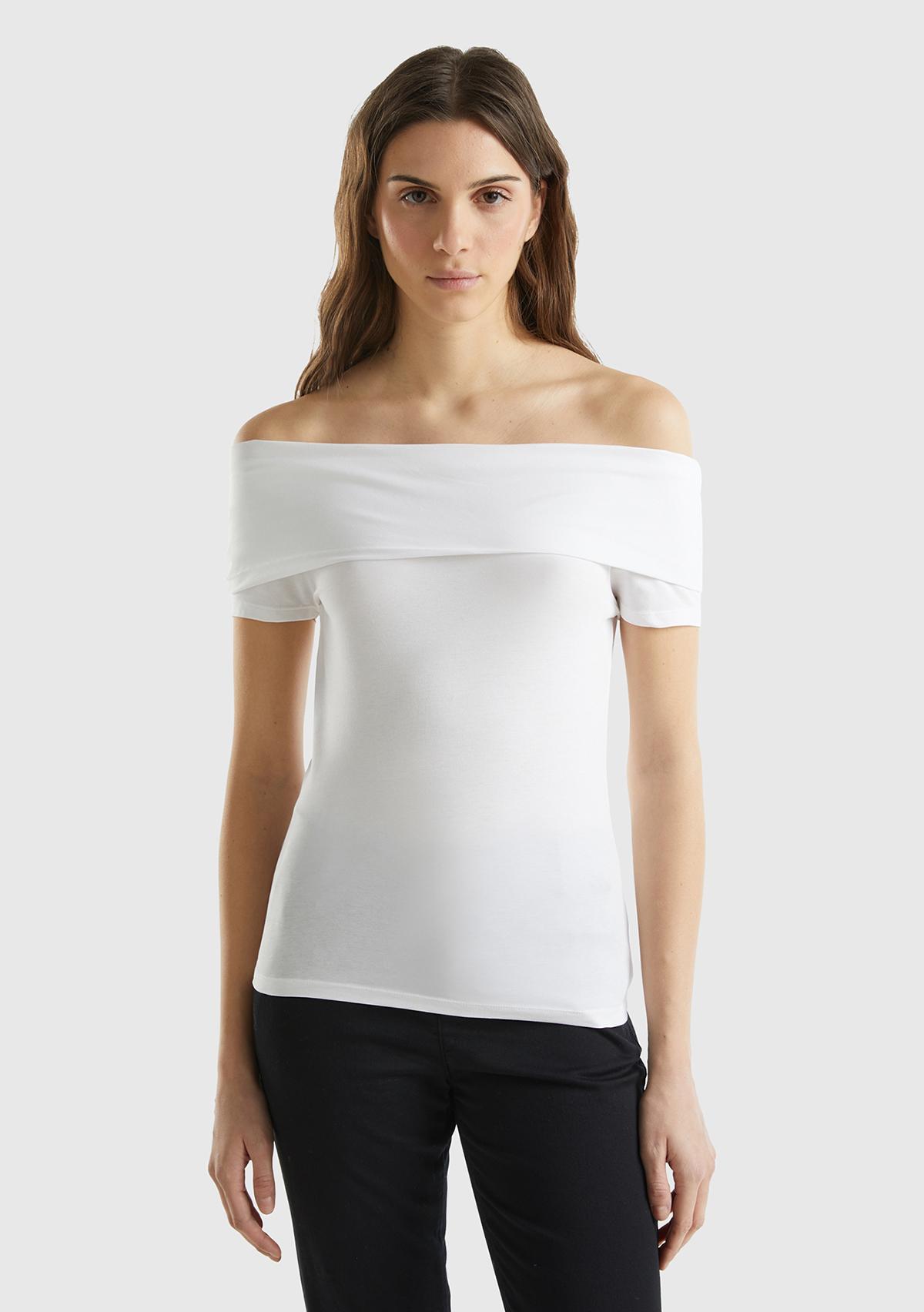 Kadın Beyaz Pamuk Karışımlı Beli Daralan Kısa Kollu Şal Yaka T-shirt