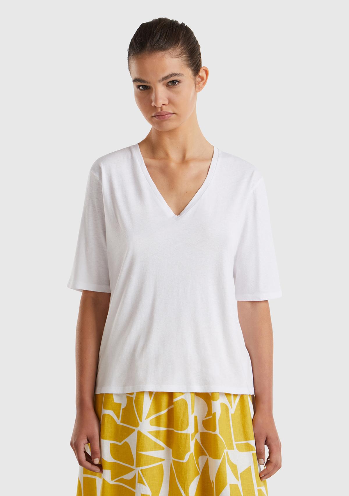 Kadın Beyaz Pamuk Keten Karışımlı V Yaka Rahat Kesim T-Shirt