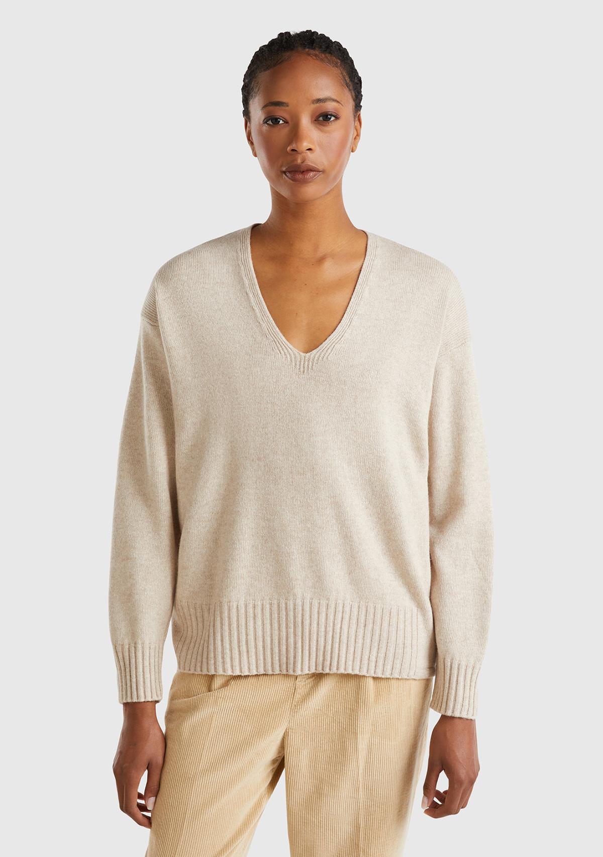 Kadın Beyaz Yün ve Viskoz Karışımlı Ribana Detaylı V Yaka Kazak. Koyun Yünü İçerir