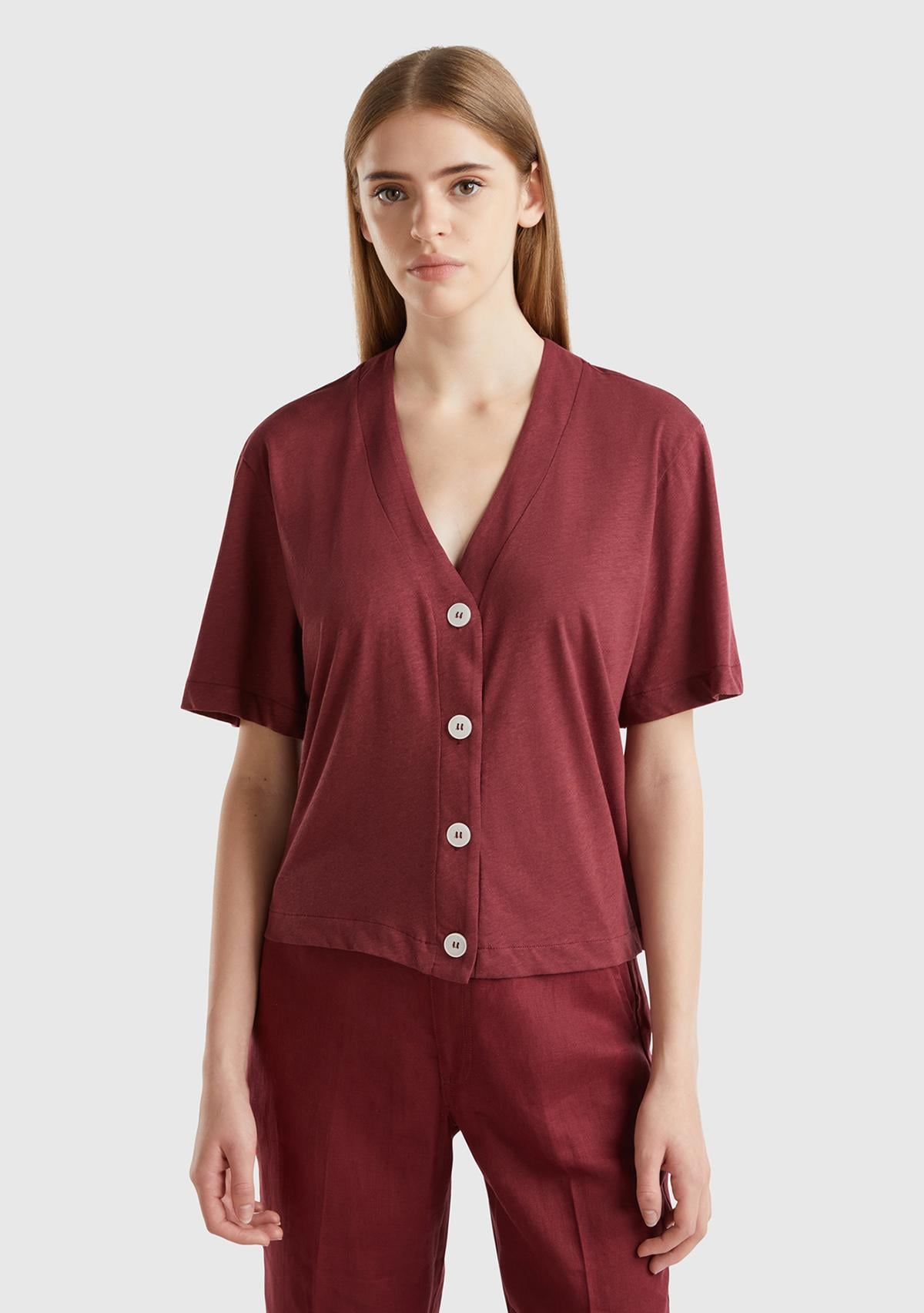 Kadın Bordo Pamuk ve Keten Karışımlı Yarım Kollu V Yaka Hırka