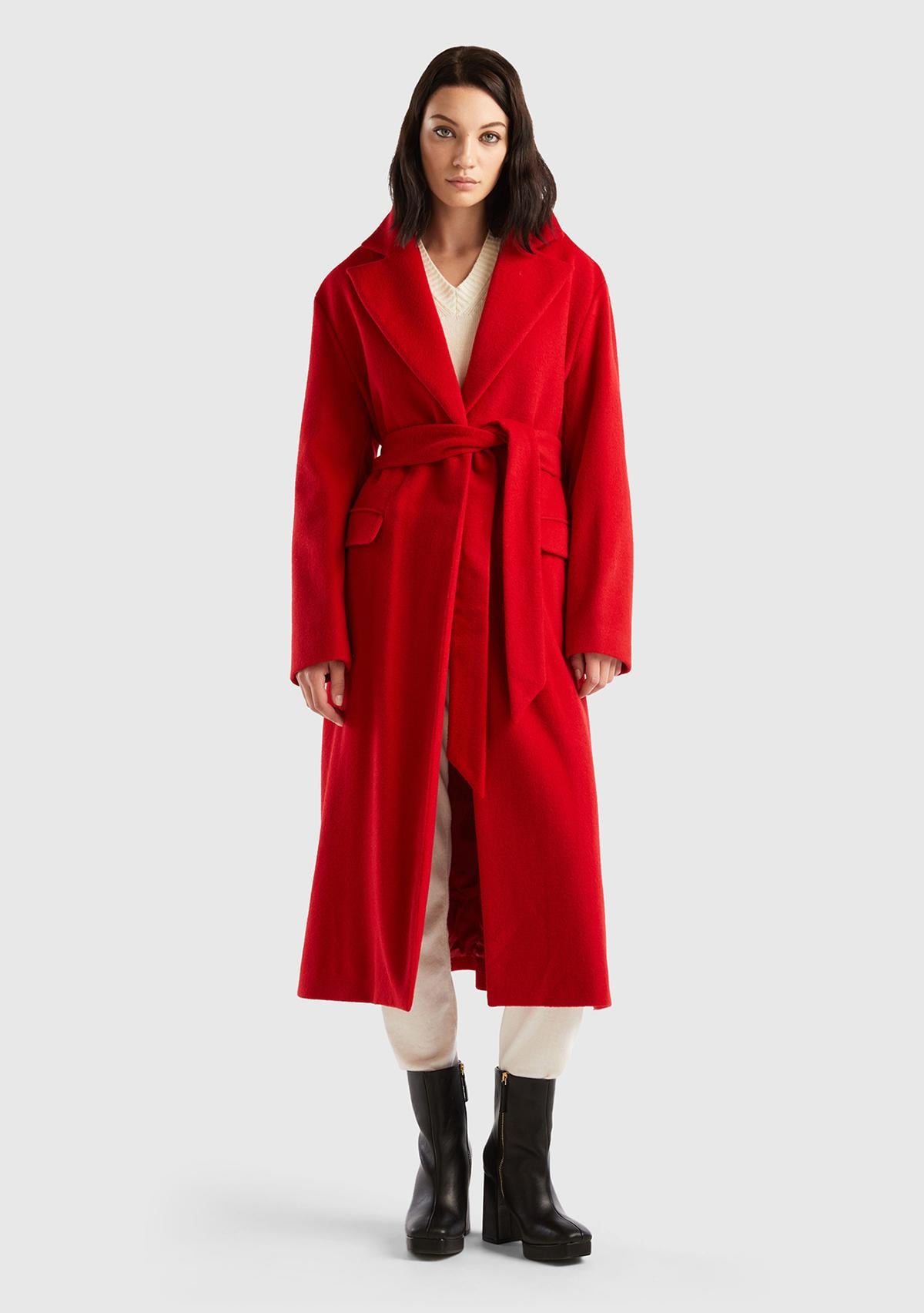 Kadın Bordo Yün Karışımlı Belden Bağlamalı Palto