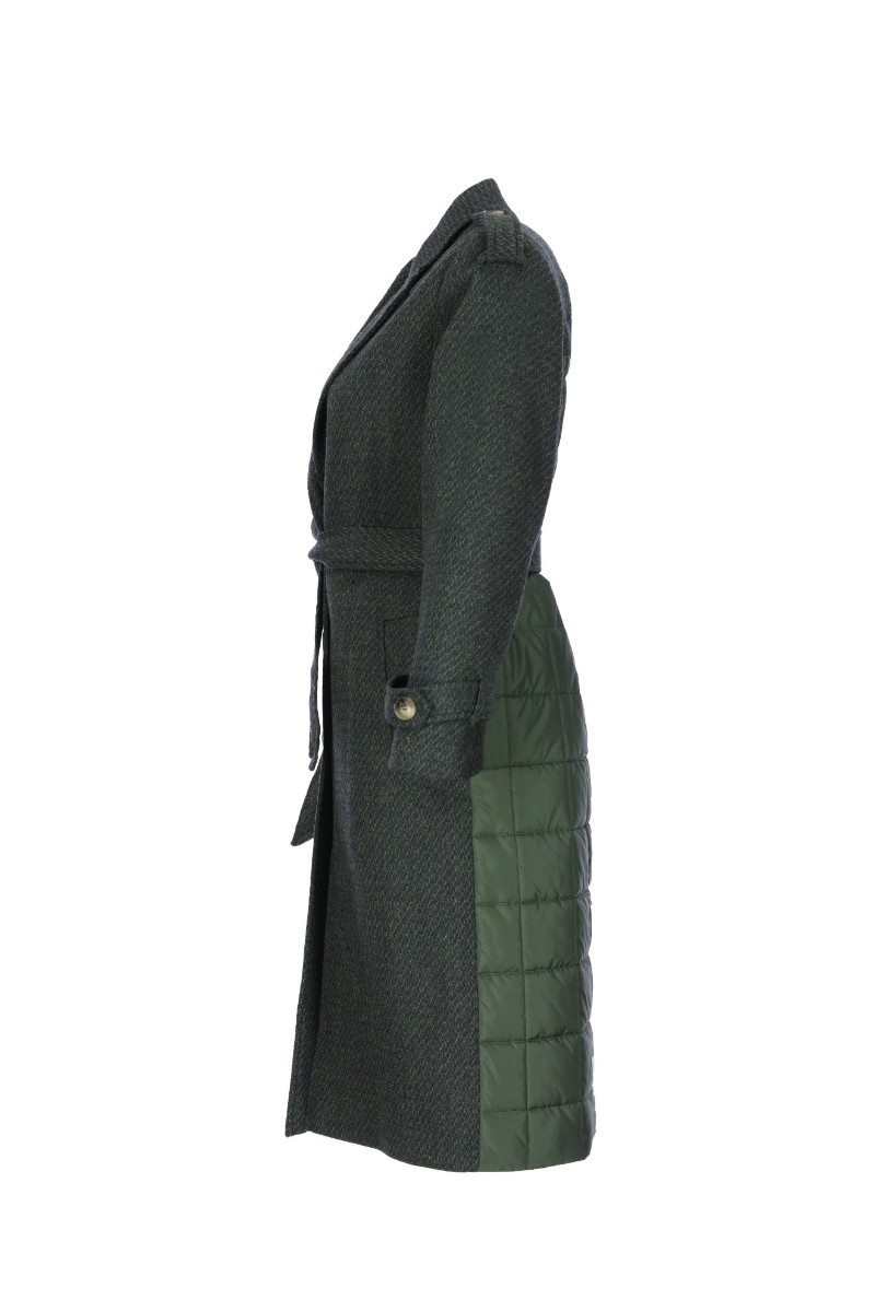 Düğme kapatmalı, yaka altı logo nakışlı, kemer bağlamalı kaban.