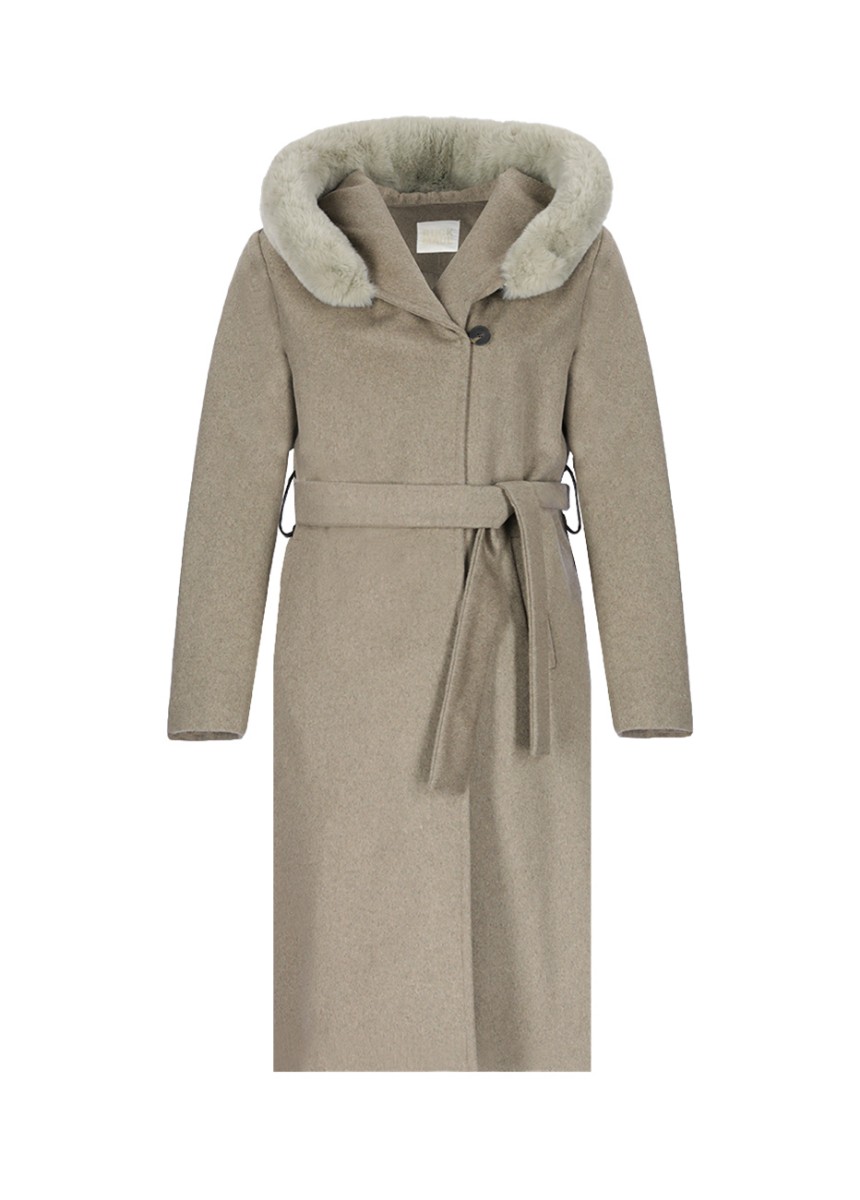 Kapişonlu, düğme kapatmalı, arma detaylı, kemer bağlamalı kaban.