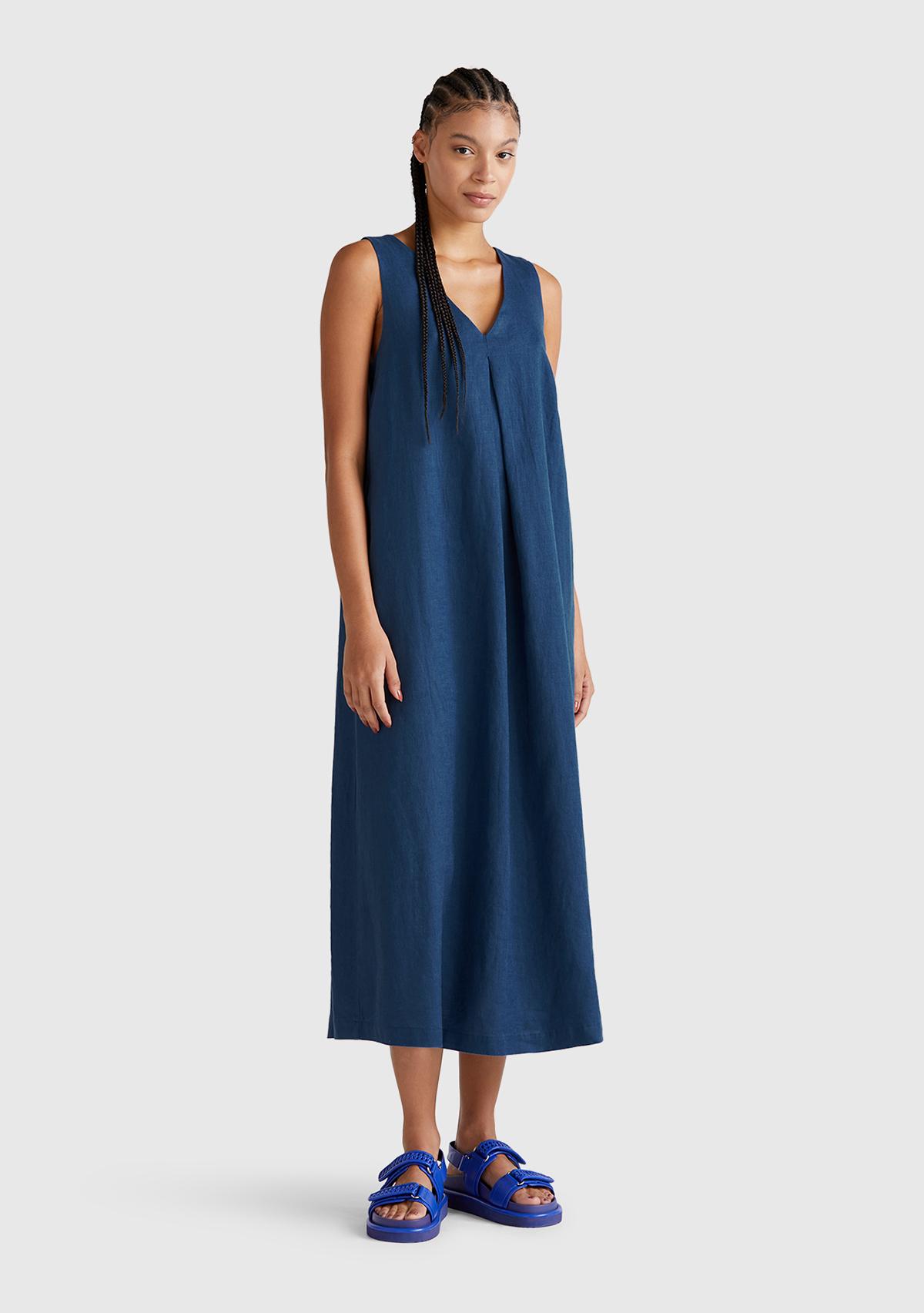 Kadın Denim %100 Keten V Yaka Kolsuz A Kesim Midi Elbise