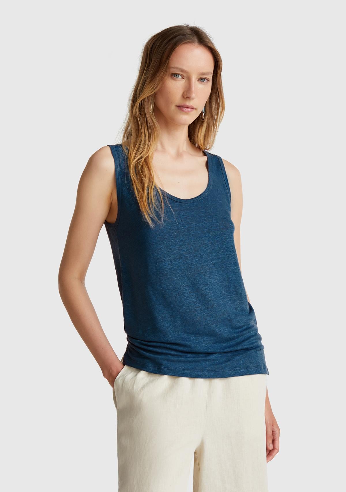 Kadın Denim %100 Keten Yanları Yırtmaçlı Regular Fit Yuvarlak Yaka Atlet