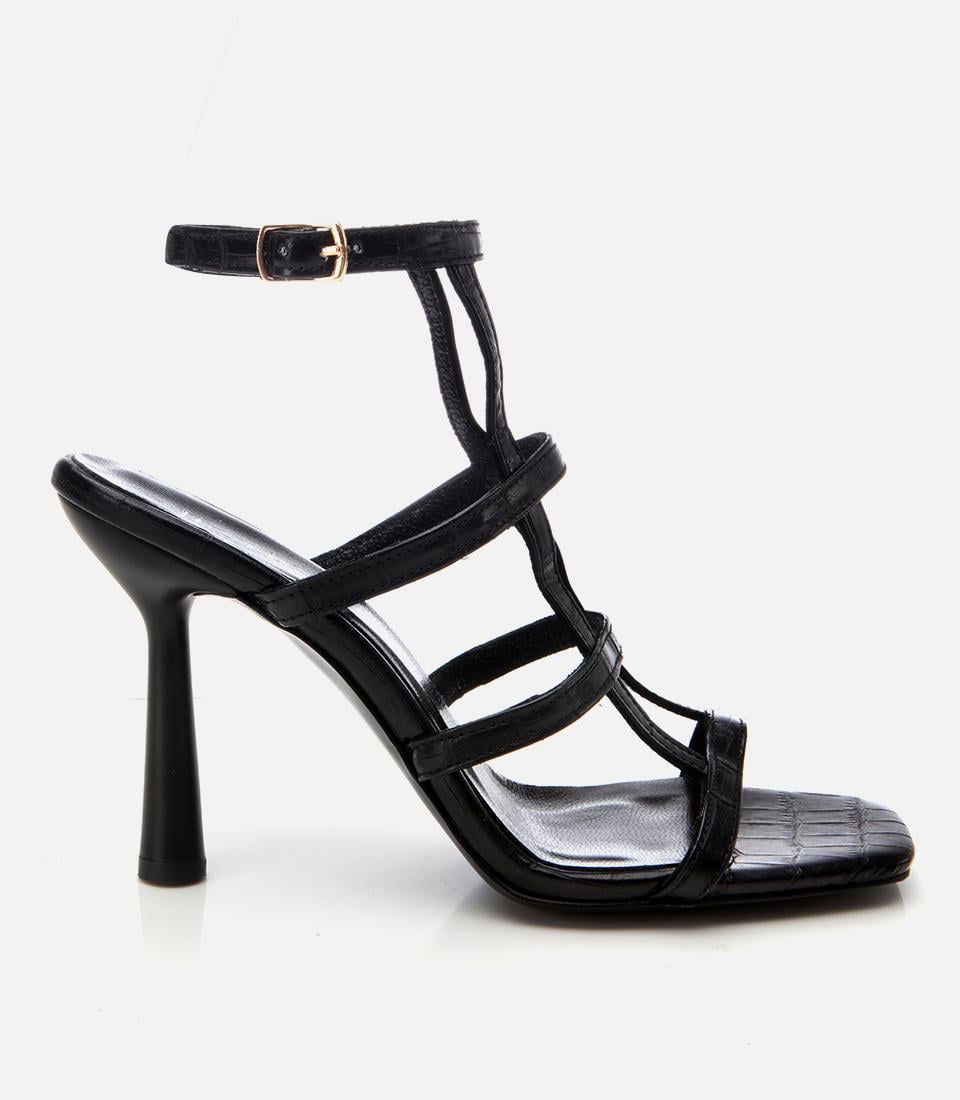 Kadın Deri Siyah Kroko Desenli Topuklu Sandalet