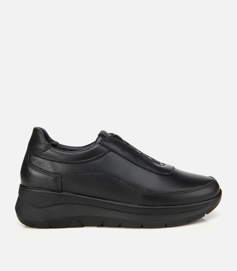Kadın Deri Siyah Lastik Detaylı Dolgu Topuklu Günlük Loafer