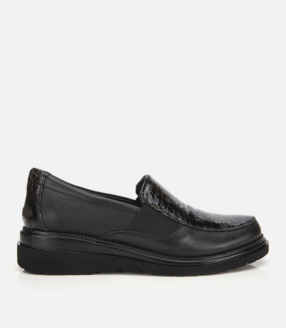 Kadın Deri Siyah Yılan Baskılı Dolgu Topuklu Günlük Loafer