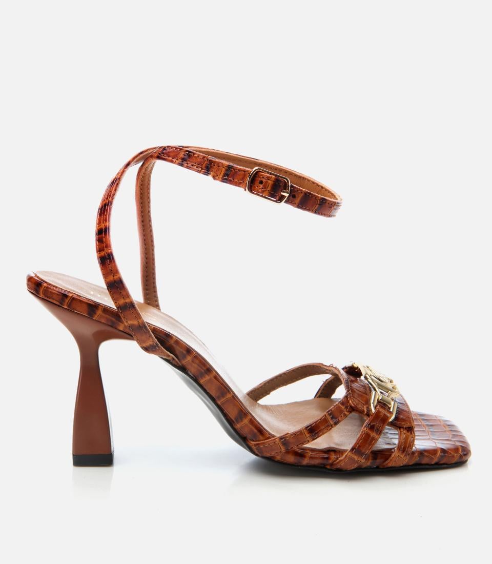 Kadın Deri Taba Kroko Desenli Topuklu Sandalet
