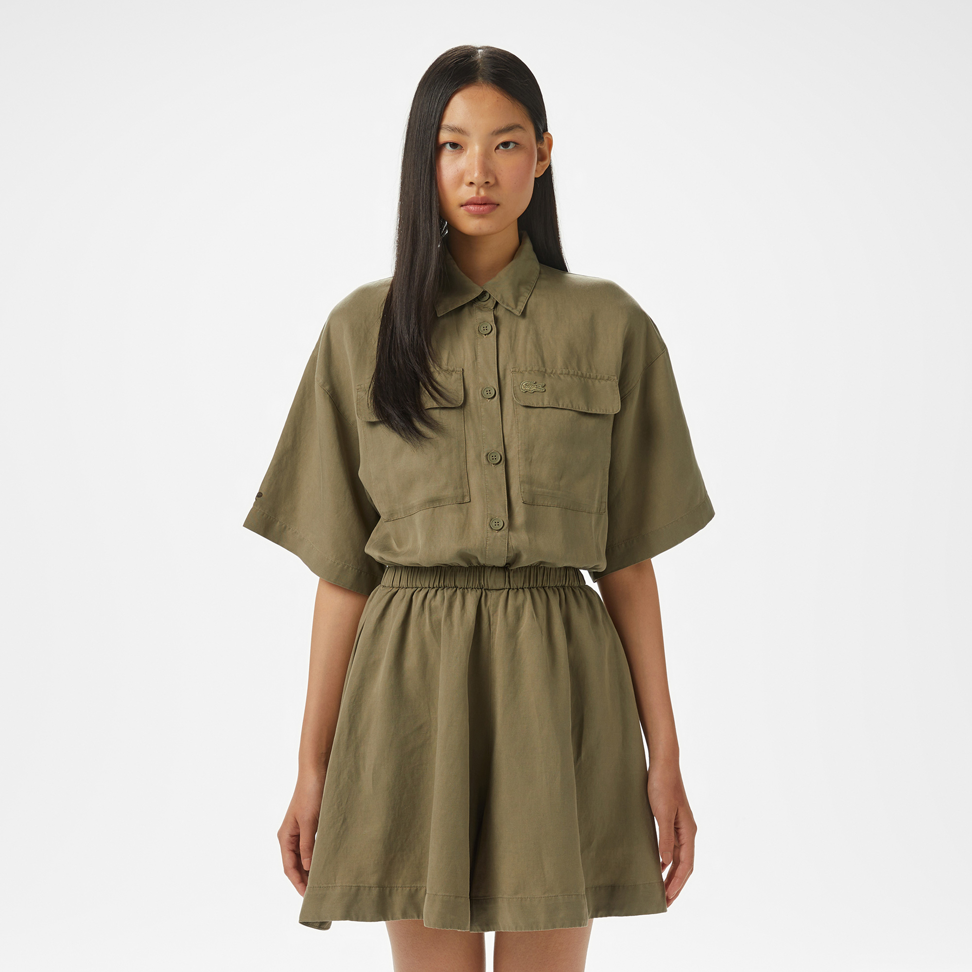 Kadın Flare Fit Kısa Kollu Gömlek Yaka Haki Elbise