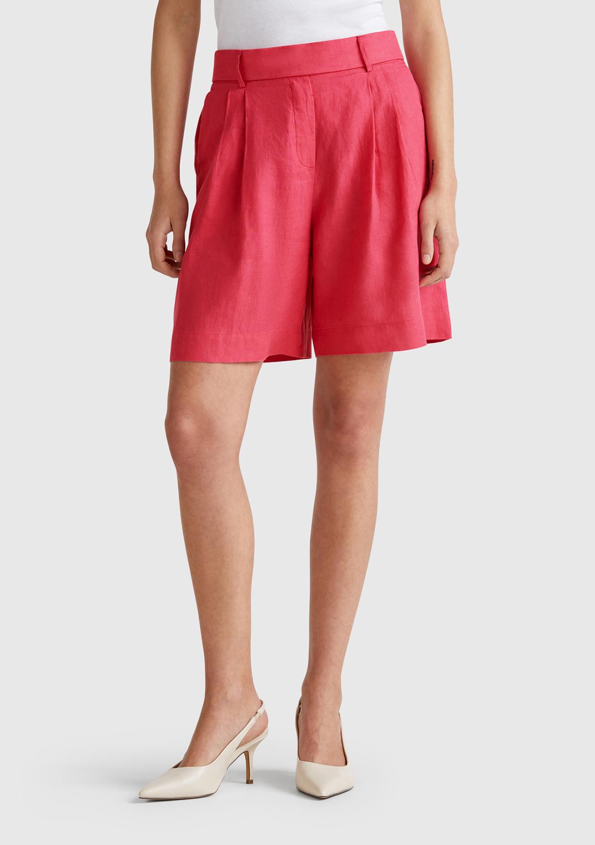 Kadın Fuşya %100 Keten Arka Beli Lastikli Pileli Relax Fit Bermuda Şort
