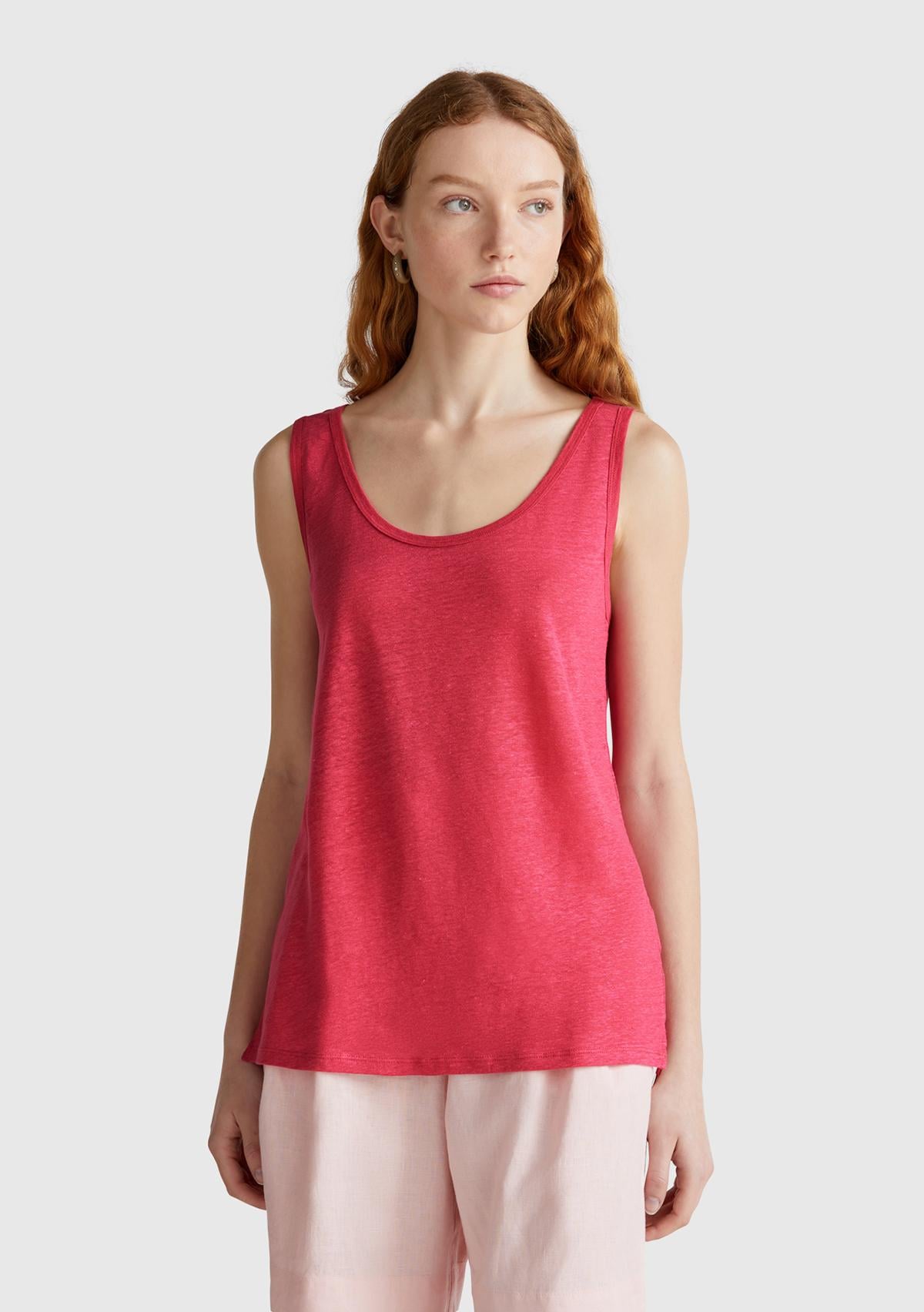 Kadın Fuşya %100 Keten Yanları Yırtmaçlı Regular Fit Yuvarlak Yaka Atlet