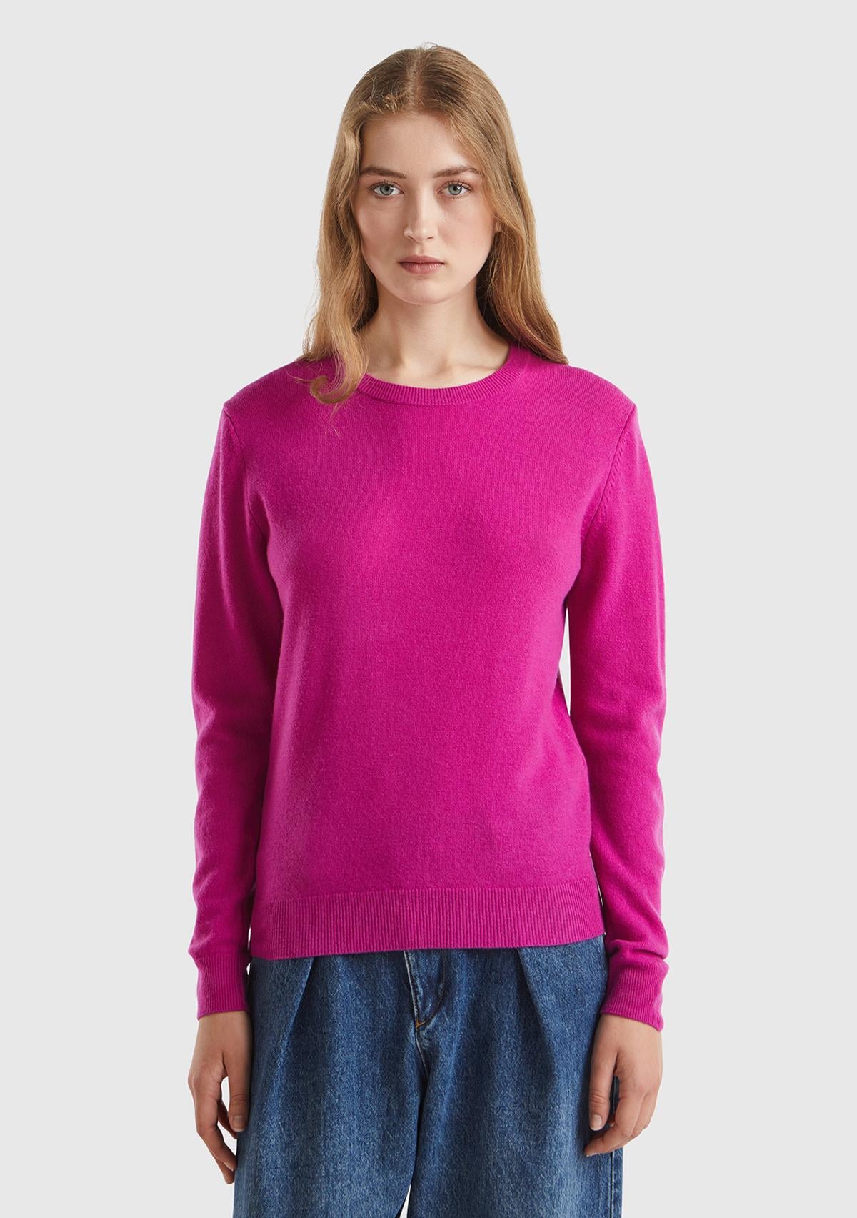 Kadın Fuşya Bisiklet Yaka %100 Merino Kazak. Koyun Yünü İçerir