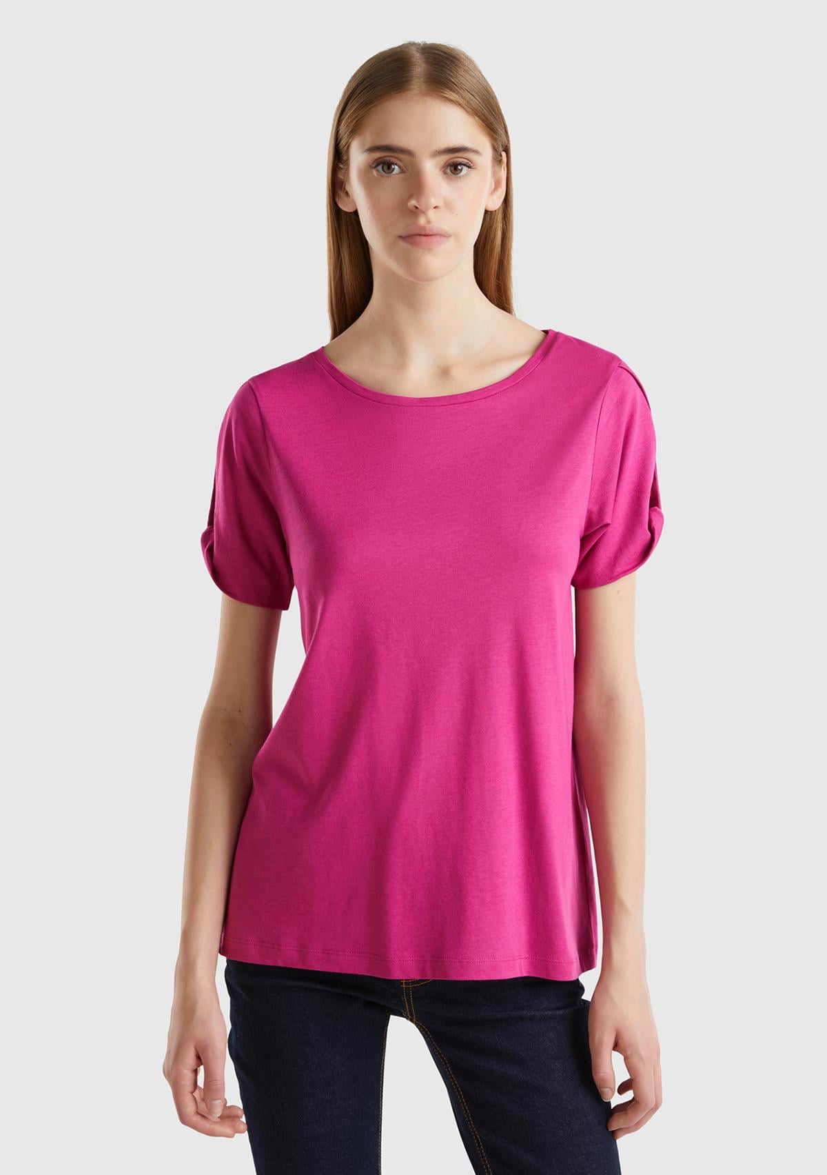 Kadın Fuşya Pamuk ve Modal Karışımlı Kol Detaylı Yuvarlak Yaka T-Shirt