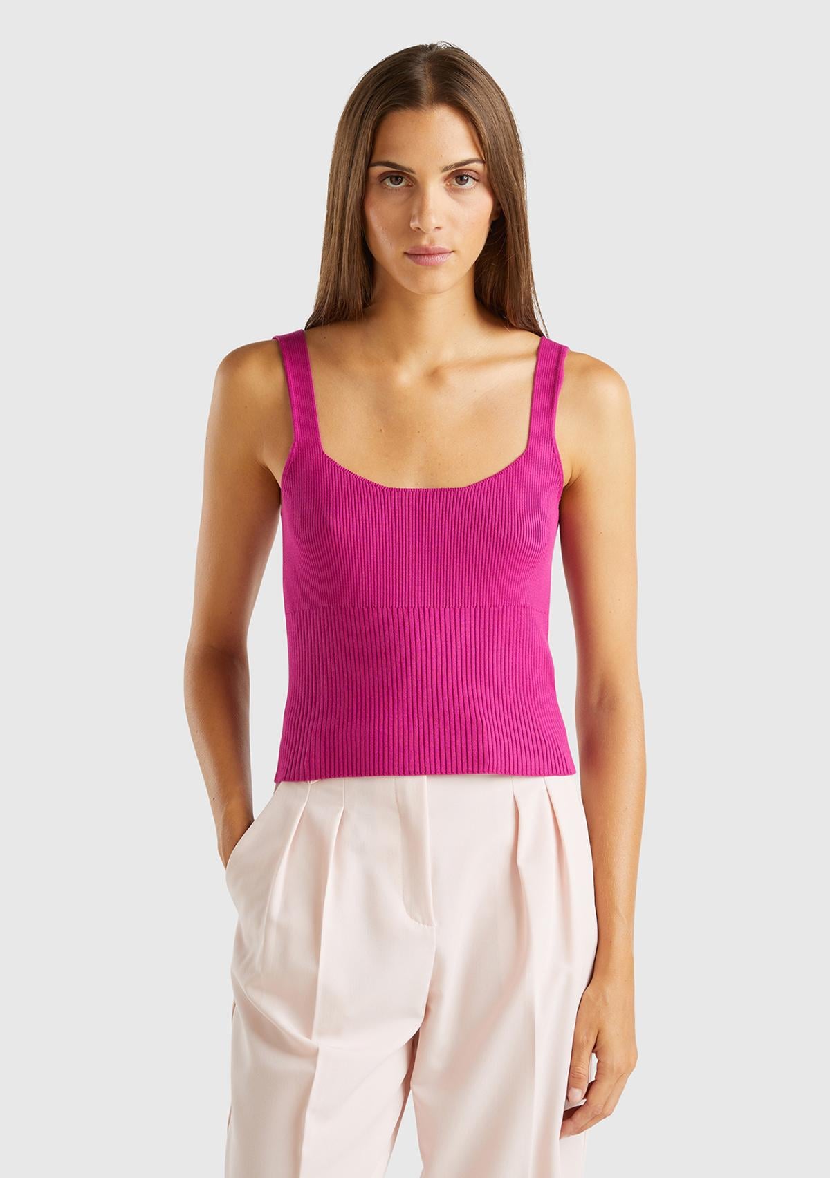 Kadın Fuşya Viskoz Karışımlı Nervür Detaylı Kare Yaka Askılı Üst