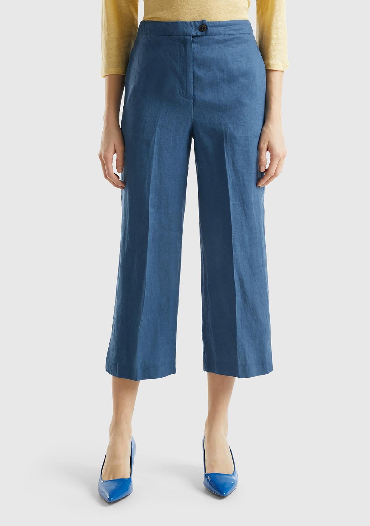 Kadın Gece Mavisi %100 Keten Düğmeli Yüksek Bel Paçası Yırtmaçlı Pantolon