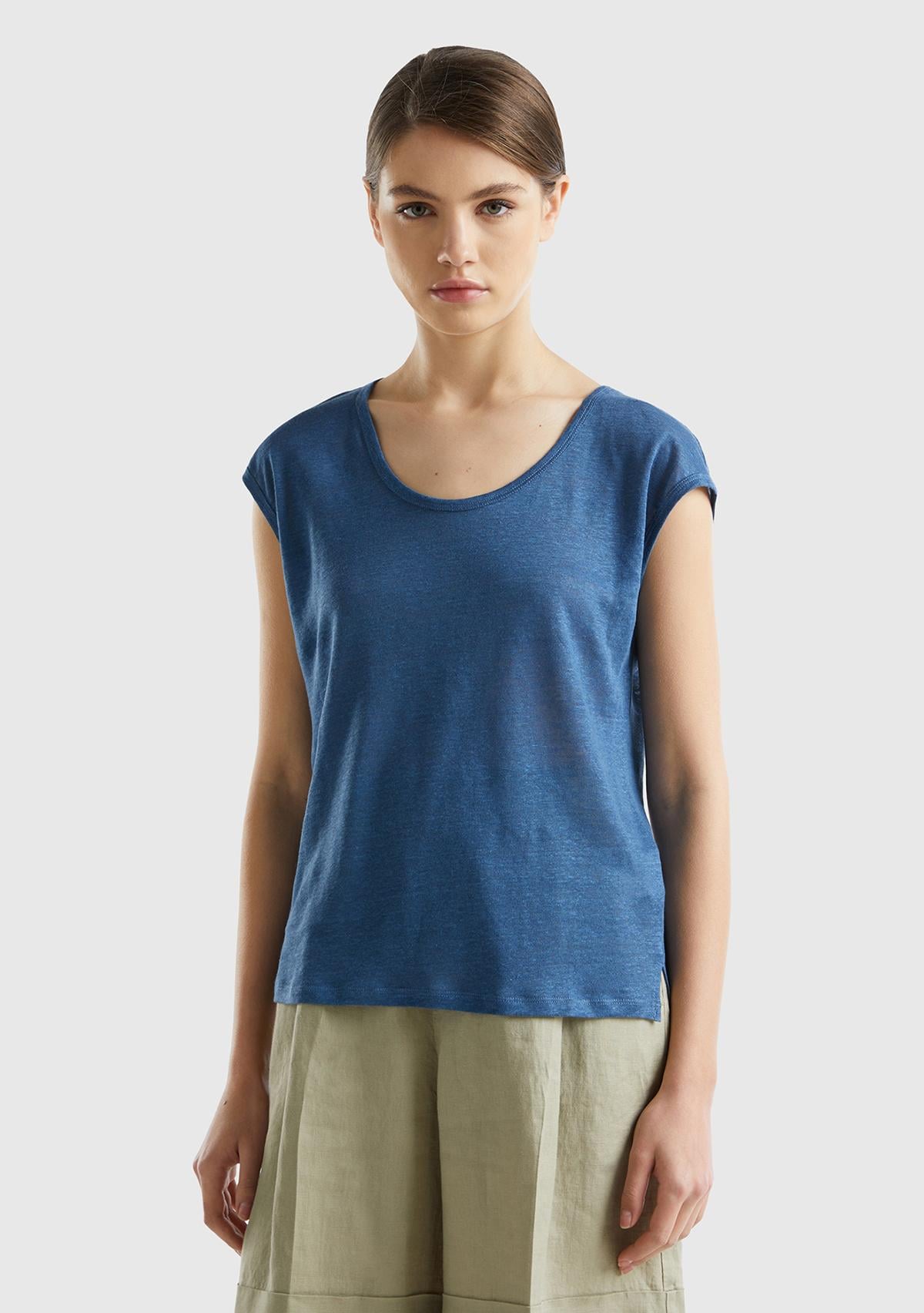 Kadın Gece Mavisi %100 Keten Rahat Kalıp Geniş Bisiklet Yaka Kolsuz T-Shirt
