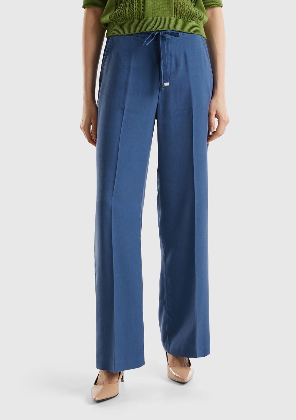 Kadın Gece Mavisi %100 Liyosel Önü Pileli Beli İpli ve Düğmeli Pantolon