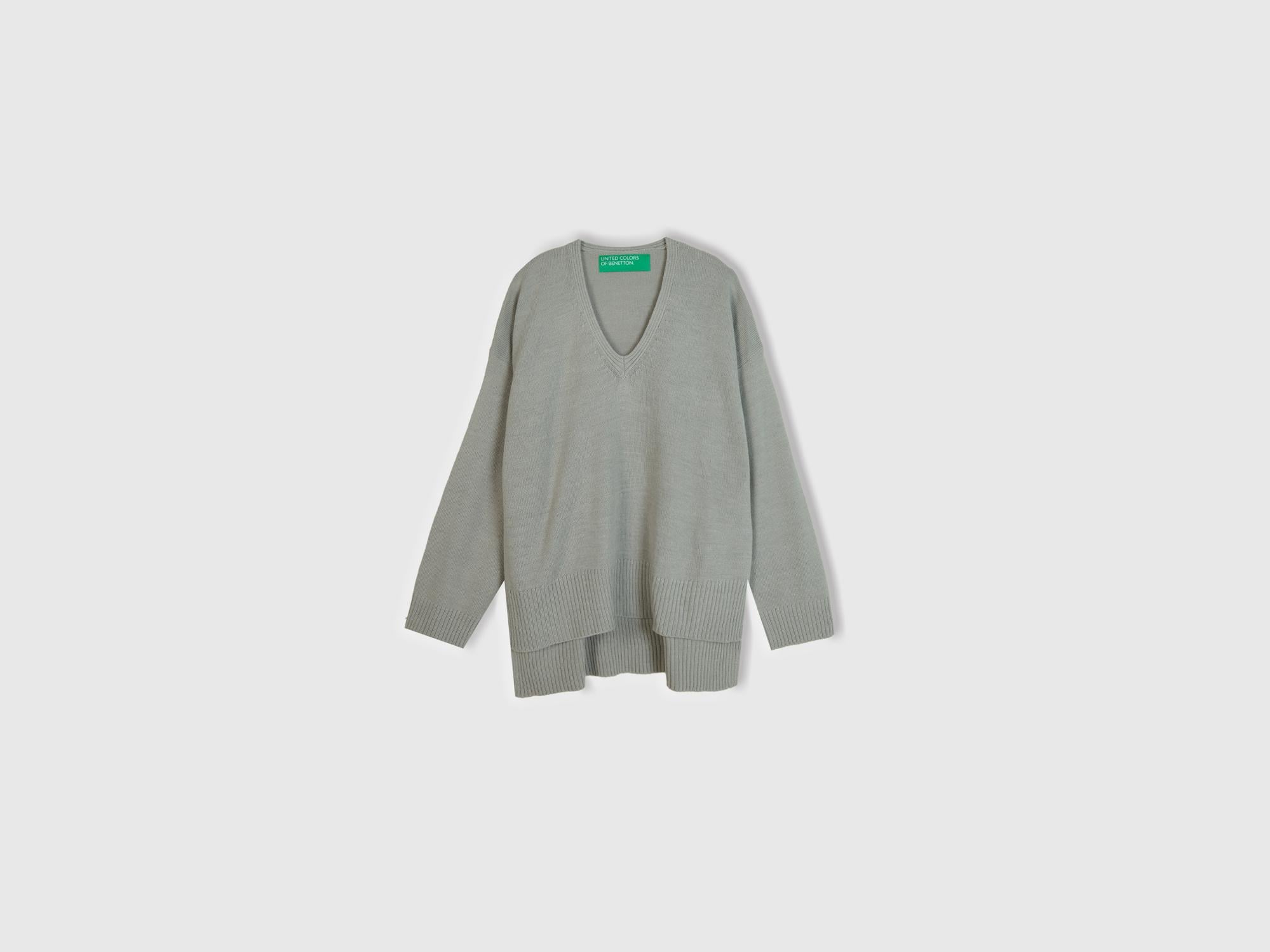 Kadın Gri Melanj Yün Karışımlı Arkası Uzun V Yaka Kazak. Koyun Yünü İçerir