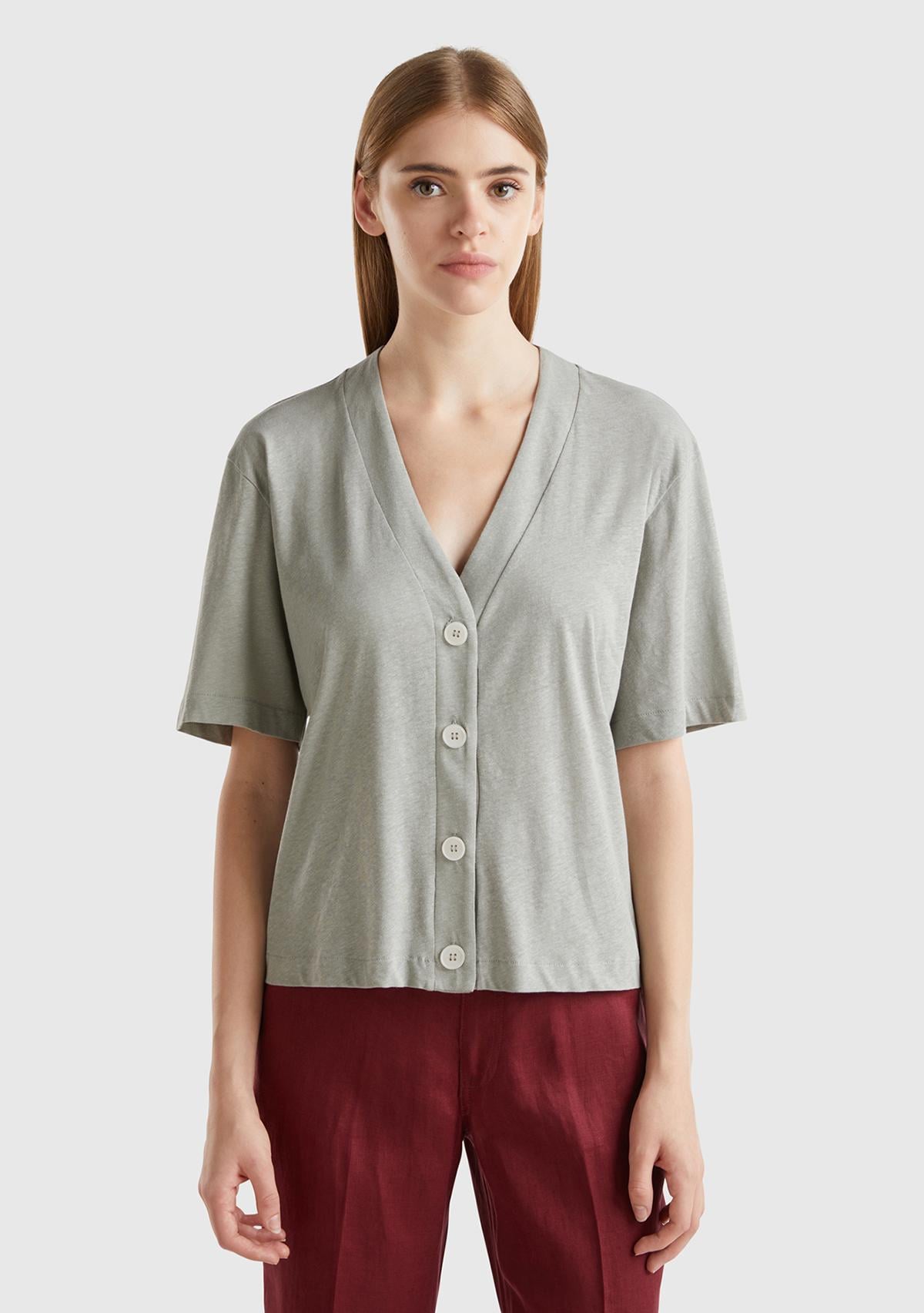 Kadın Gri Pamuk ve Keten Karışımlı Yarım Kollu V Yaka Hırka
