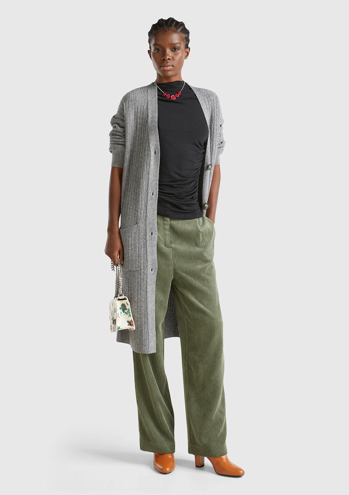 Kadın Gri Yün Karışımlı Önü Düğme Detaylı Cepli Uzun V Yaka Hırka. Koyun Yünü İçerir
