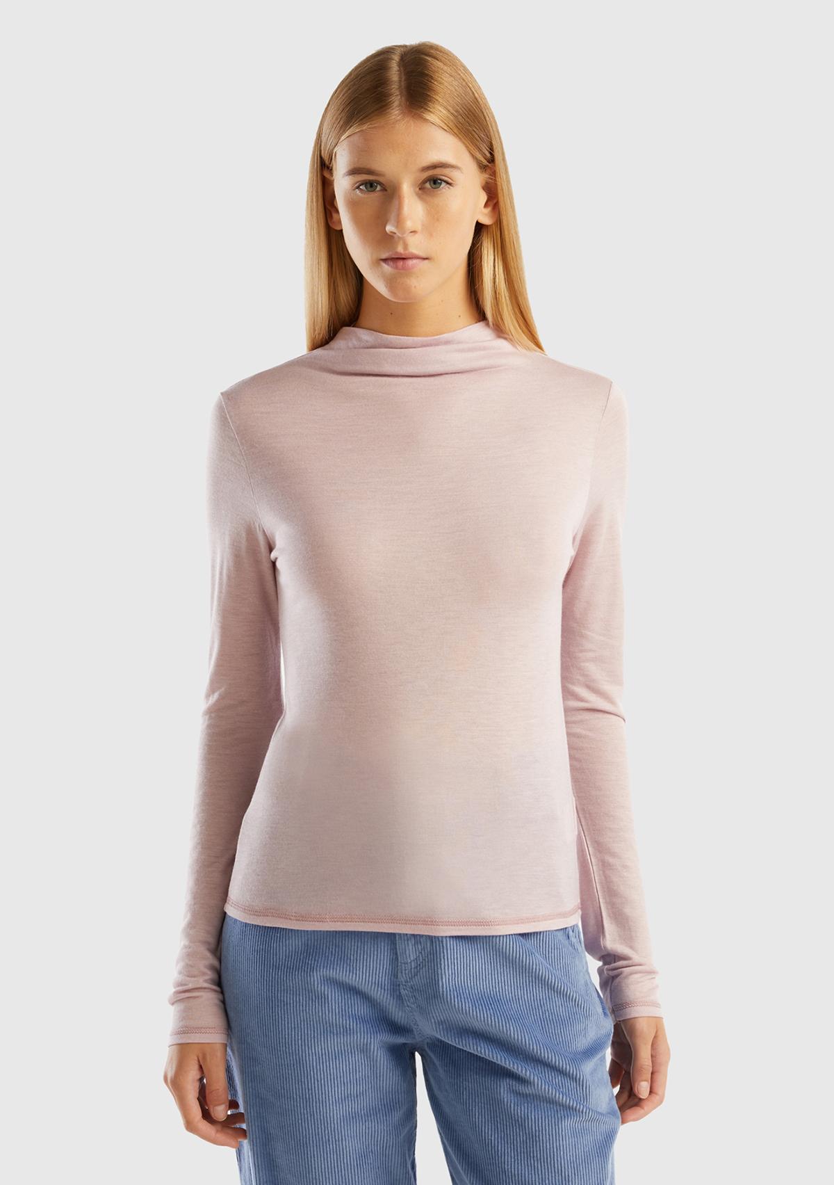Kadın Gül Kurusu Viskoz/Yün Karışımlı Uzun Kollu Yarım Balıkçı T-Shirt