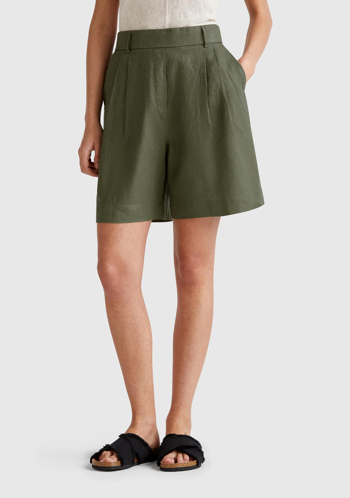 Kadın Haki %100 Keten Arka Beli Lastikli Pileli Relax Fit Bermuda Şort