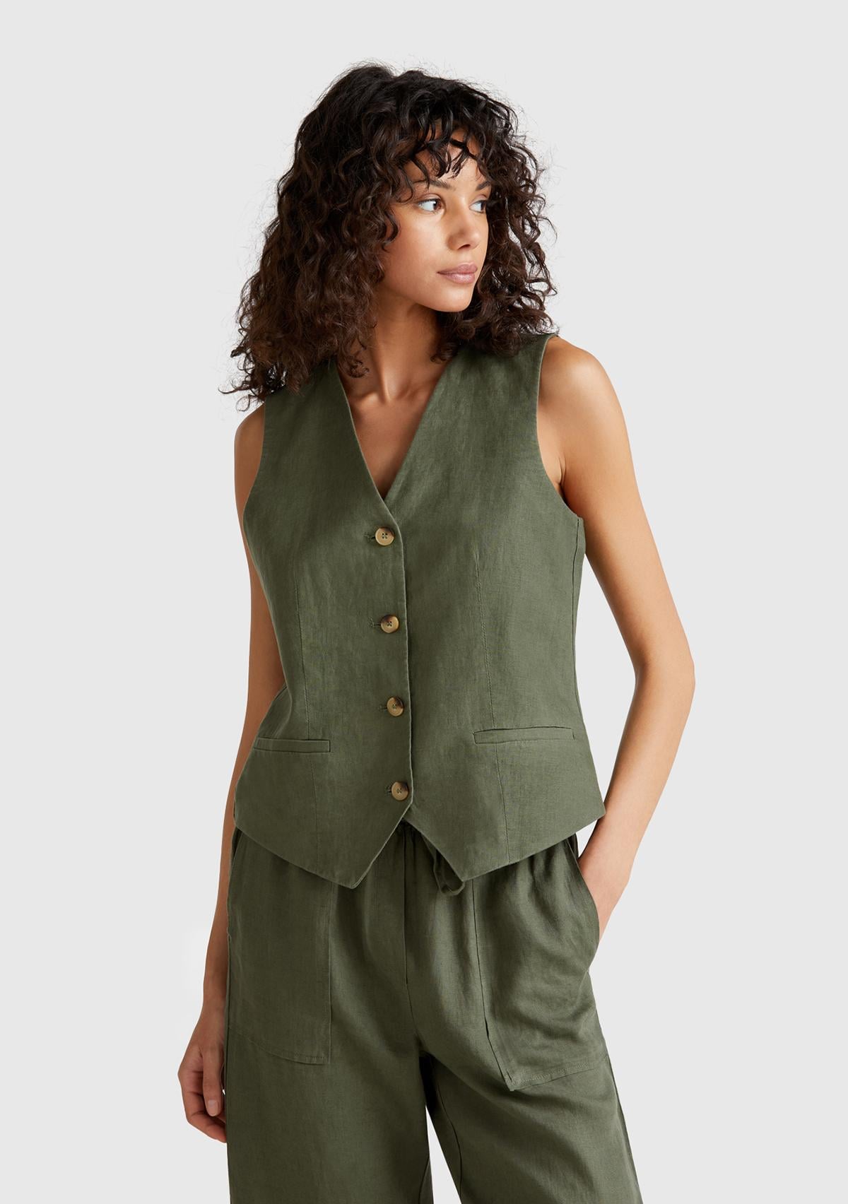 Kadın Haki %100 Keten Önü Düğme İliklemeli V Yaka Yelek